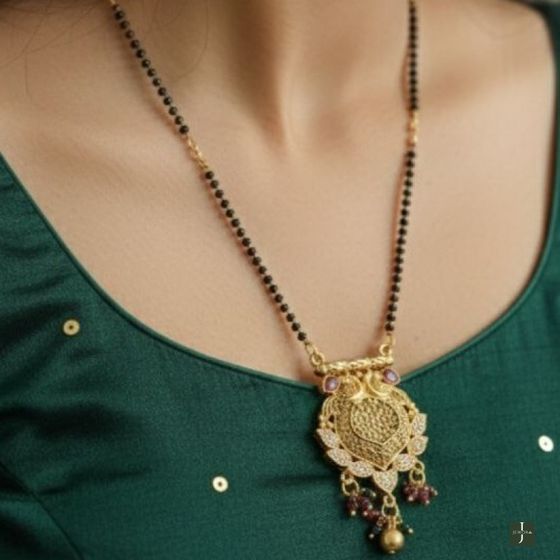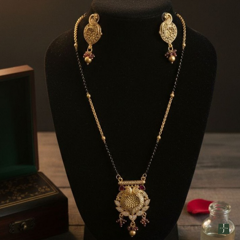 Celebrate sacred tradition with regal artistry through this Royal Peacock Temple Mangalsutra Set. Designed with an intricately carved peacock motif pendant, this set reflects classic temple jewellery craftsmanship. The pendant is highlighted with kundan-style stones, ruby and green bead drops, and a rich antique gold finish that gives it a timeless heirloom appeal. Paired with matching peacock-inspired earrings and a traditional black-beaded mangalsutra chain, this set is perfect for daily cultural wear as well as festive and ceremonial occasions.