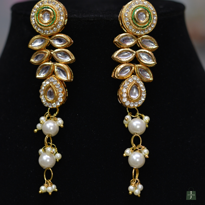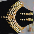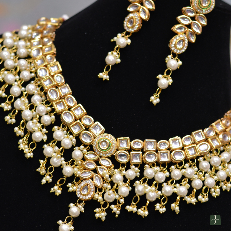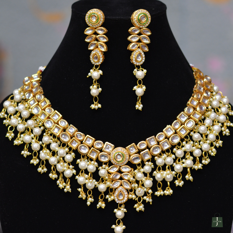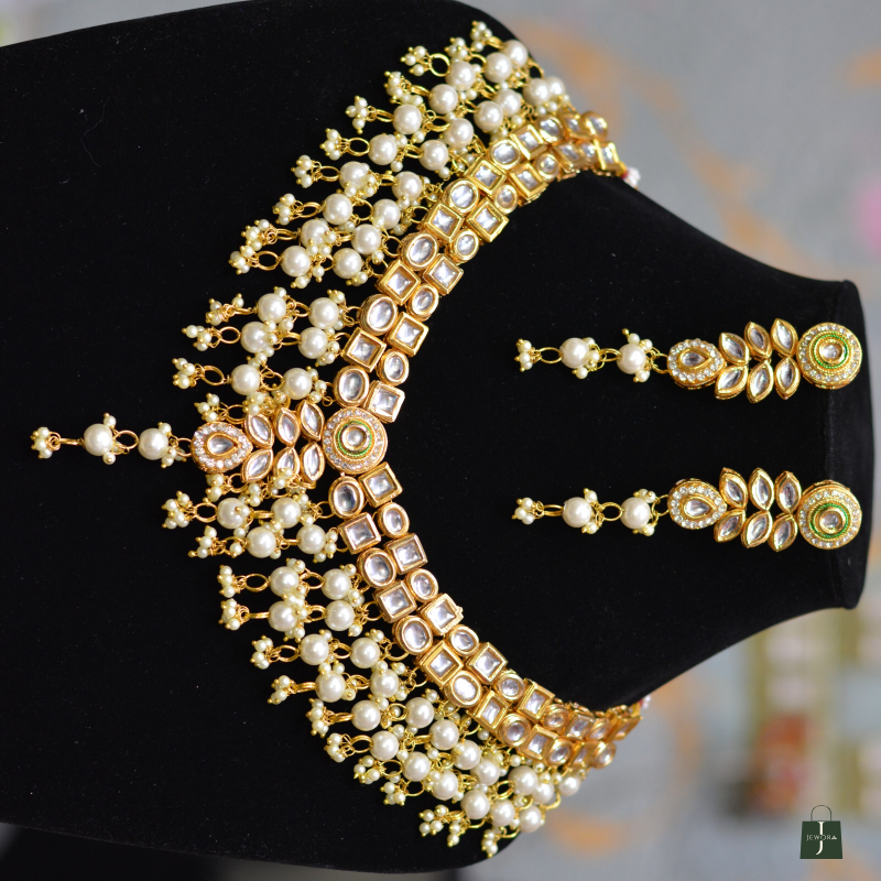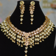 A regal wedding-ready Kundan set adorned with sparkling Polki stones and graceful pearl hangings that add movement and charm. The detailed craftsmanship and rich gold finish enhance its premium appeal, while the coordinated earrings complete the royal look. Ideal for brides and grand occasions where elegance matters.