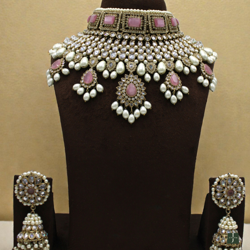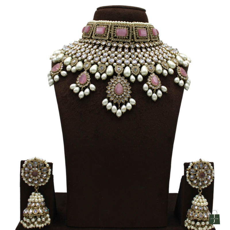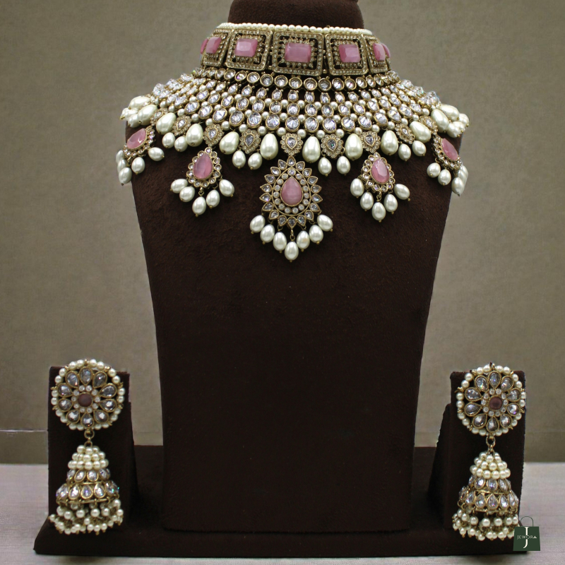 The necklace is enhanced with elegant off-white pearl drops and teardrop pink stone motifs, creating a rich and luxurious bridal look. Paired with intricately designed pearl jhumka earrings, this set is perfect for weddings, receptions, and festive occasions.
