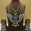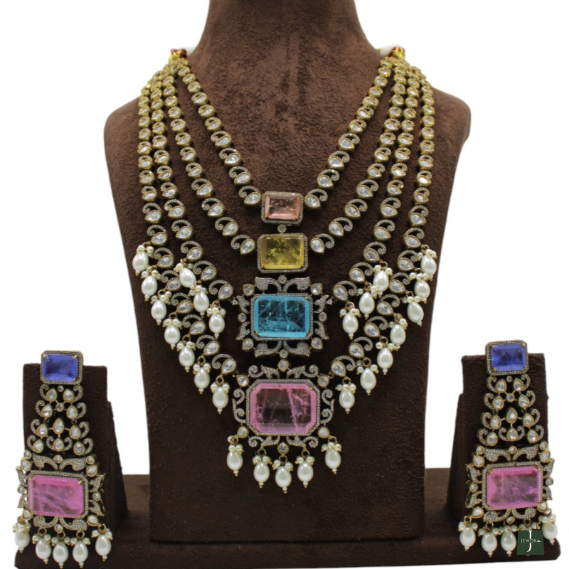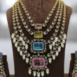 Make a bold and luxurious statement with this exquisite layered necklace set featuring vibrant multicolor rectangular stones beautifully arranged in a cascading design. The necklace is adorned with sparkling white stones and elegant pearl drops, adding richness and depth to the overall look. The layered pattern enhances the grandeur, making it a perfect choice for weddings, receptions, festive celebrations, and bridal occasions.