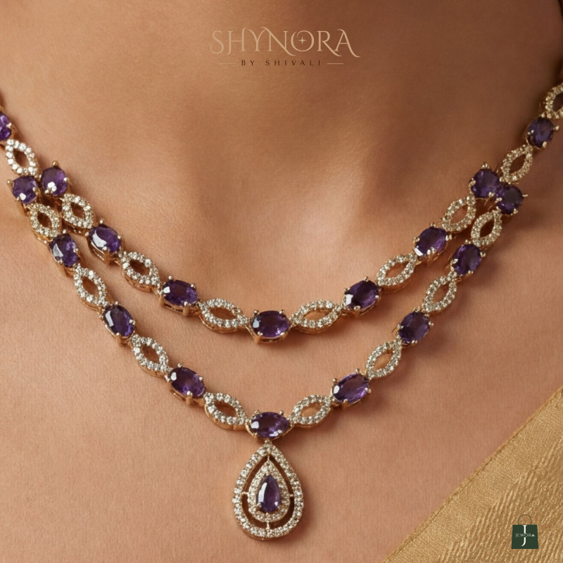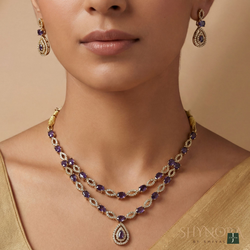A stunning choice for customers looking for a royal purple AD necklace set with a layered, luxurious look