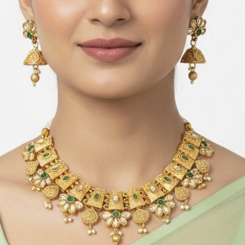 Enhance your traditional look with this beautifully crafted antique gold necklace set inspired by classic heritage designs. The necklace features alternating floral and rectangular motifs adorned with vibrant multicolor stones, creating a rich and festive appearance. Intricate detailing and delicate pearl bead hangings add elegance and movement to the design. Paired with matching floral stud jhumka earrings, this set is perfect for weddings, festive celebrations, and cultural occasions.