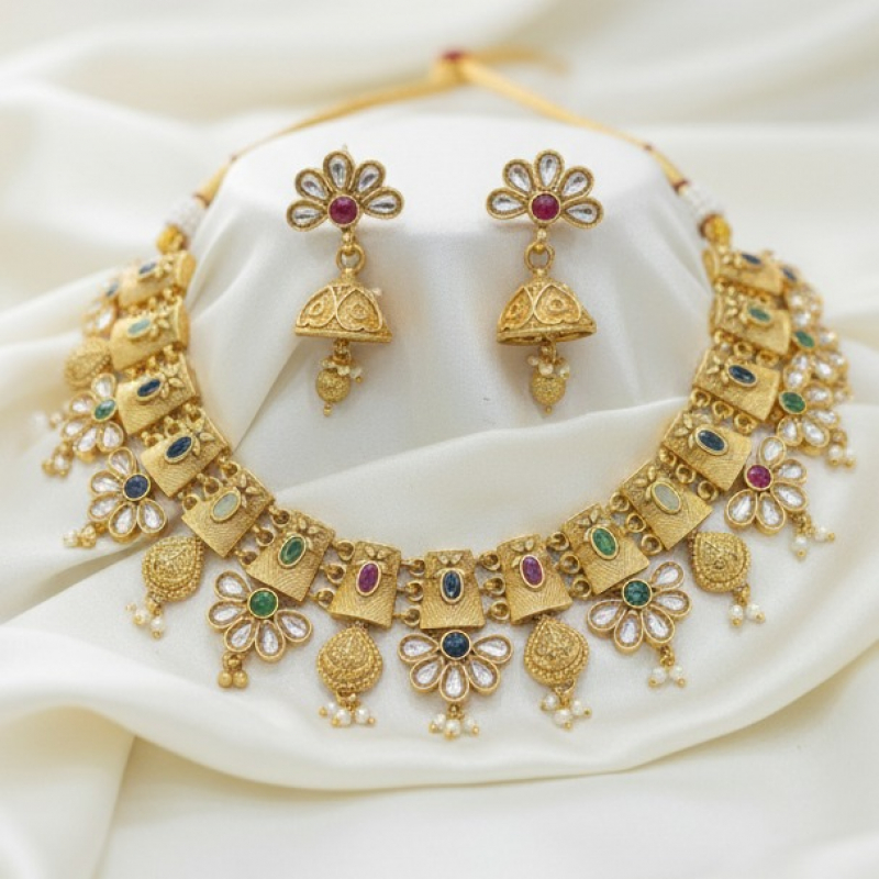 Enhance your traditional look with this beautifully crafted antique gold necklace set inspired by classic heritage designs. The necklace features alternating floral and rectangular motifs adorned with vibrant multicolor stones, creating a rich and festive appearance. Intricate detailing and delicate pearl bead hangings add elegance and movement to the design. Paired with matching floral stud jhumka earrings, this set is perfect for weddings, festive celebrations, and cultural occasions.