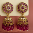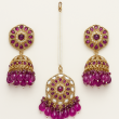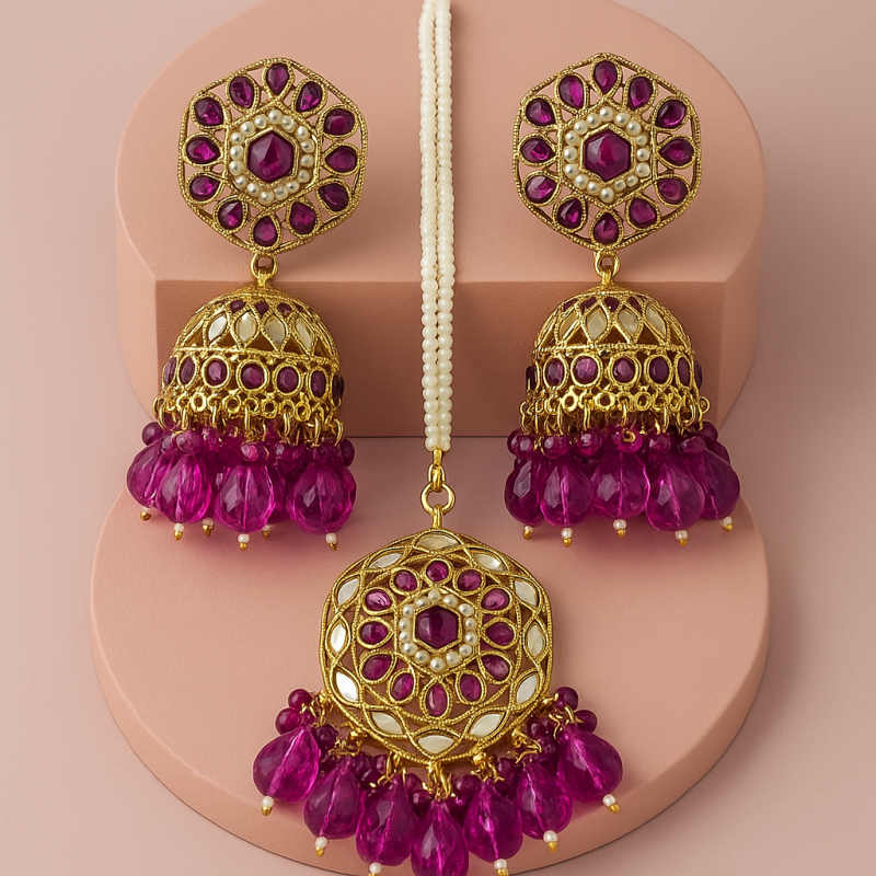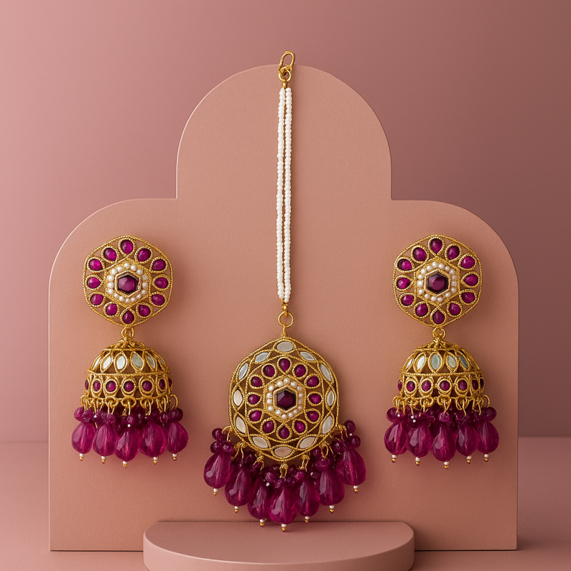 Elevate your festive look with the stunning Royal Ruby Beaded Jhumka Set, a perfect blend of traditional charm and intricate craftsmanship. This gorgeous set includes a pair of statement jhumka earrings and a matching maang tikka, each adorned with rich ruby-colored stones framed by delicate white beads. The gold-plated base enhances the vibrant purple-pink tones, making the jewelry stand out beautifully against any outfit. The jhumkas feature a dome-shaped lattice design, embellished with glistening bead drops that add movement and elegance. Perfect for weddings, festive occasions, or cultural celebrations, this set pairs effortlessly with sarees, lehengas, and anarkalis. Designed for women who appreciate timeless ethnic beauty, the Royal Ruby Beaded Jhumka Set is lightweight, comfortable, and sure to turn heads wherever you go. Add this piece to your jewelry collection for a regal and graceful finish to your ensemble.