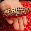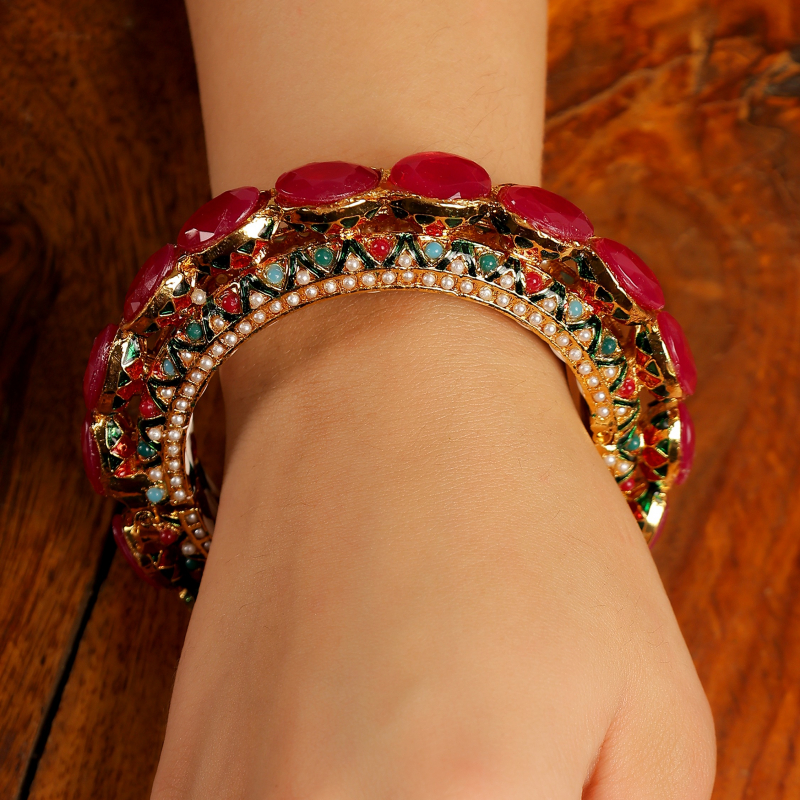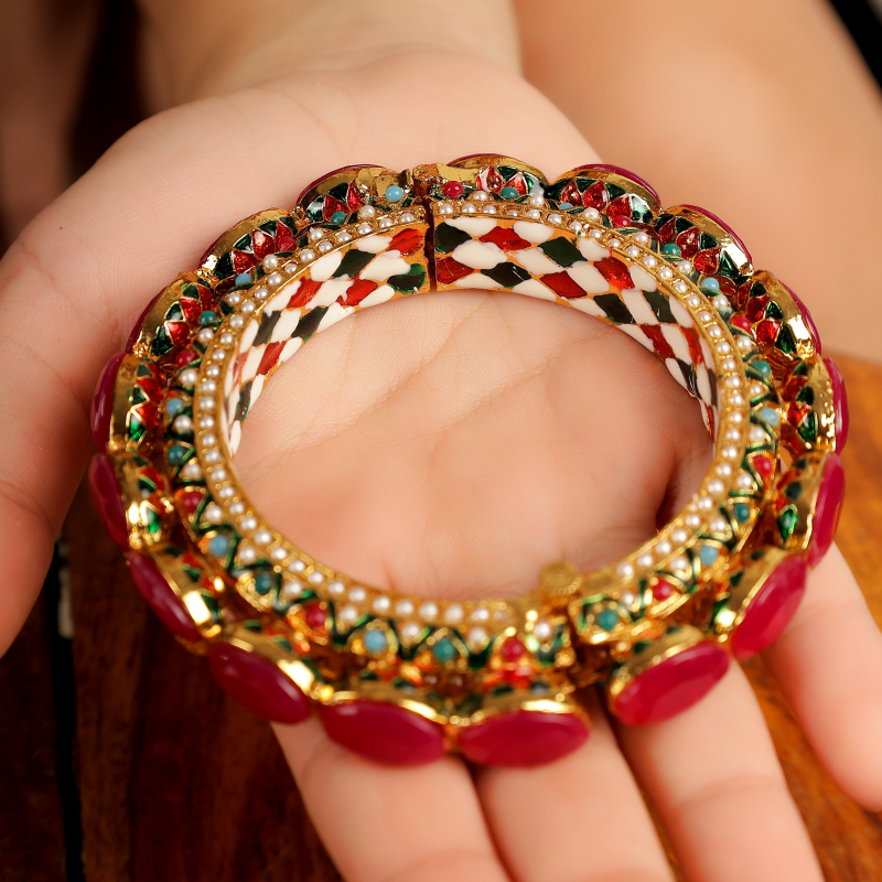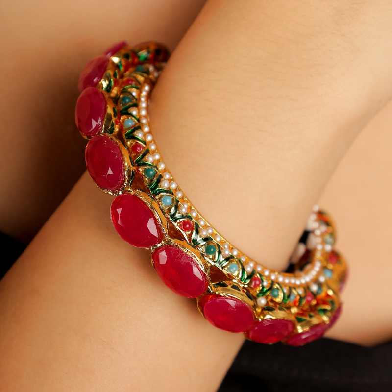 Add a royal touch to your jewelry collection with this stunning handcrafted bangle. Designed with vibrant oval-shaped red stones, this piece beautifully blends traditional artistry with modern elegance. The intricate meenakari work in green and subtle hints of blue enhances its rich golden base, while delicate pearl accents add a graceful charm.