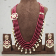 Elevate your traditional look with this exquisite multi-layered ruby bead necklace set, beautifully accented with intricate Kundan floral motifs and elegant pearl danglers. Designed to reflect royal heritage craftsmanship, this statement set includes a grand necklace and matching earrings, making it ideal for bridal wear, festive celebrations, and special occasions.