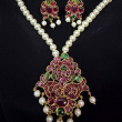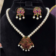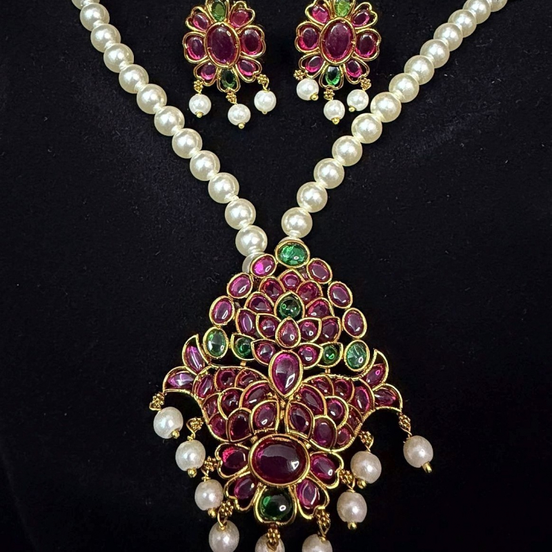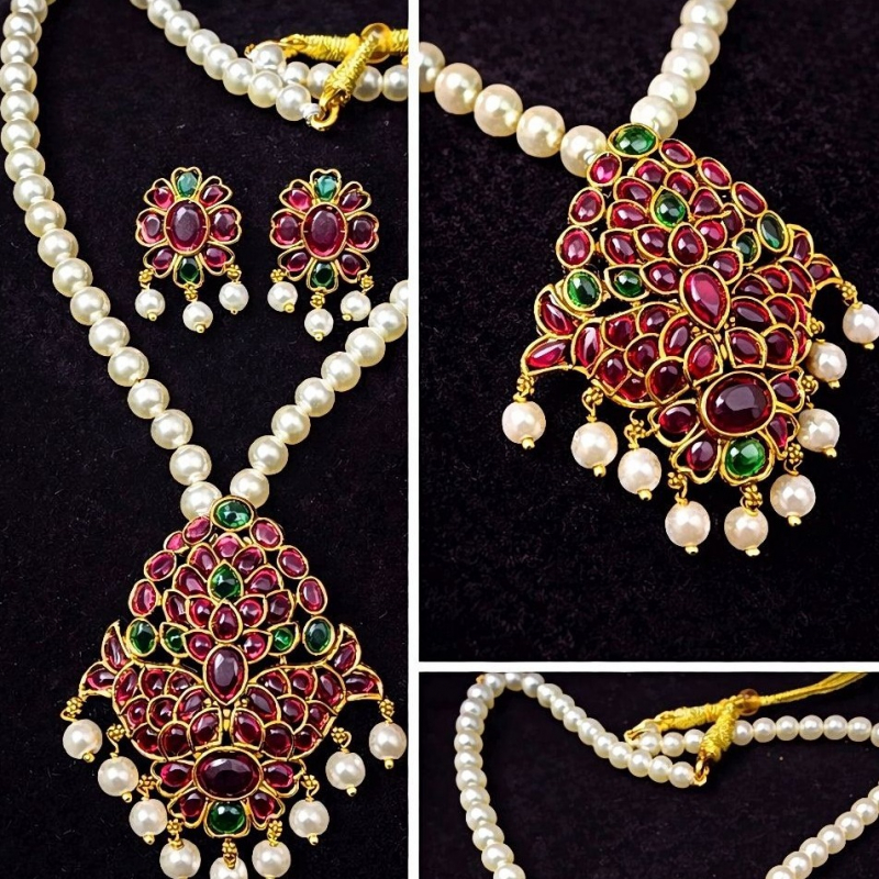 Make a graceful statement with this exquisite Royal Ruby Pearl Pendant Necklace Set, designed to reflect classic royal charm. The necklace features a delicate string of lustrous white pearls, beautifully complemented by a grand pendant adorned with rich ruby-toned stones and subtle emerald accents. The intricate craftsmanship and antique gold polish enhance its traditional appeal, while the matching floral earrings with pearl drops complete the elegant look. Perfect for weddings, festive occasions, and cultural celebrations, this set adds a luxurious touch to any ethnic outfit, making you stand out with effortless sophistication.