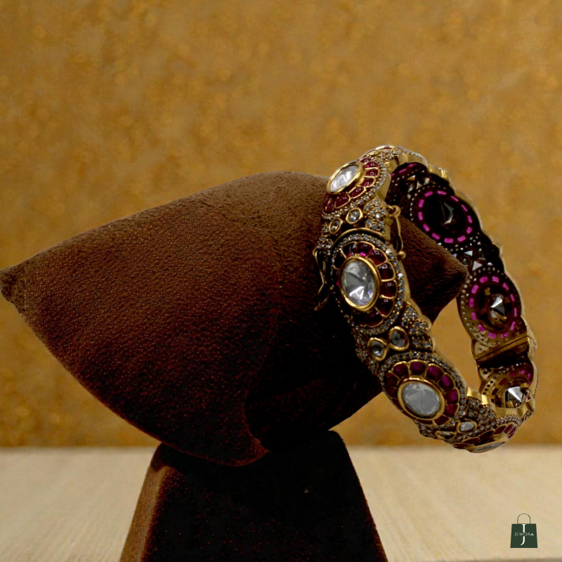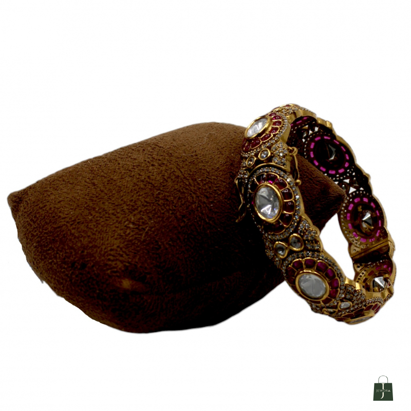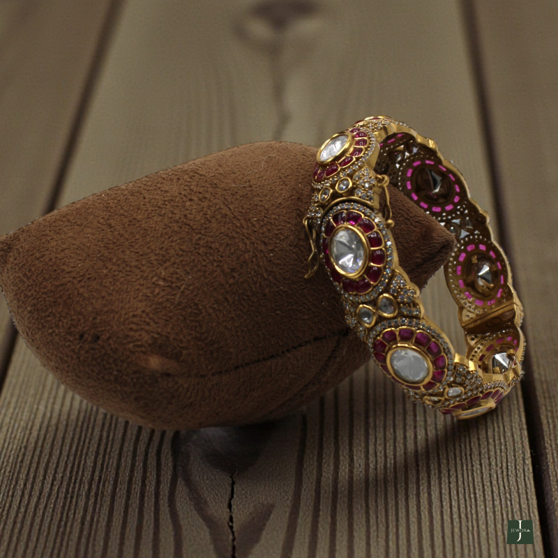Add a touch of royal elegance to your jewellery collection with this stunning Royal Ruby Polki Openable Kada. Designed with bold oval Polki stones at the center of each segment, the bracelet is beautifully framed with rich ruby red enamel detailing and micro crystal accents.