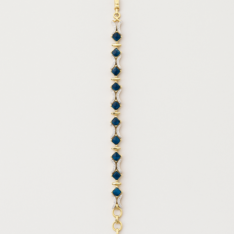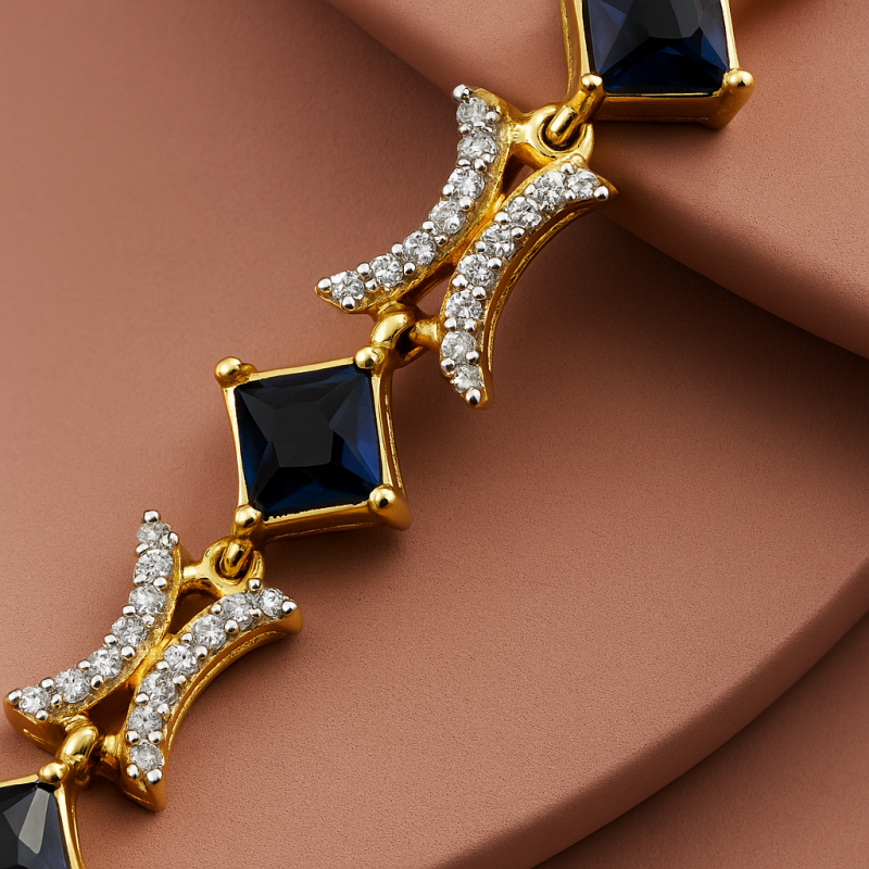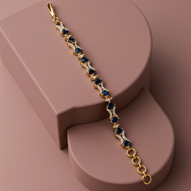 Elevate your elegance with this exquisite Royal Sapphire Diamond Bracelet, a perfect blend of sophistication and modern charm. The bracelet features deep sapphire blue stones, meticulously set in alternating diamond-studded frames, creating a striking contrast of richness and sparkle. Crafted with a high-quality gold-toned base, the piece highlights the luxury of traditional artistry with a contemporary edge. Its adjustable clasp ensures a secure and comfortable fit, making it suitable for both festive occasions and formal gatherings. Whether worn solo or paired with matching accessories, this bracelet is designed to captivate attention with its timeless allure and radiant craftsmanship. Add this premium piece to your jewelry collection to embrace a royal statement that never goes unnoticed.
