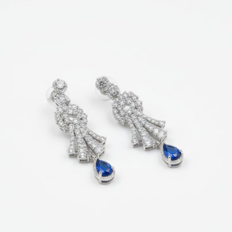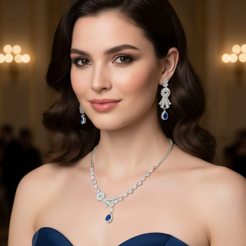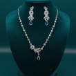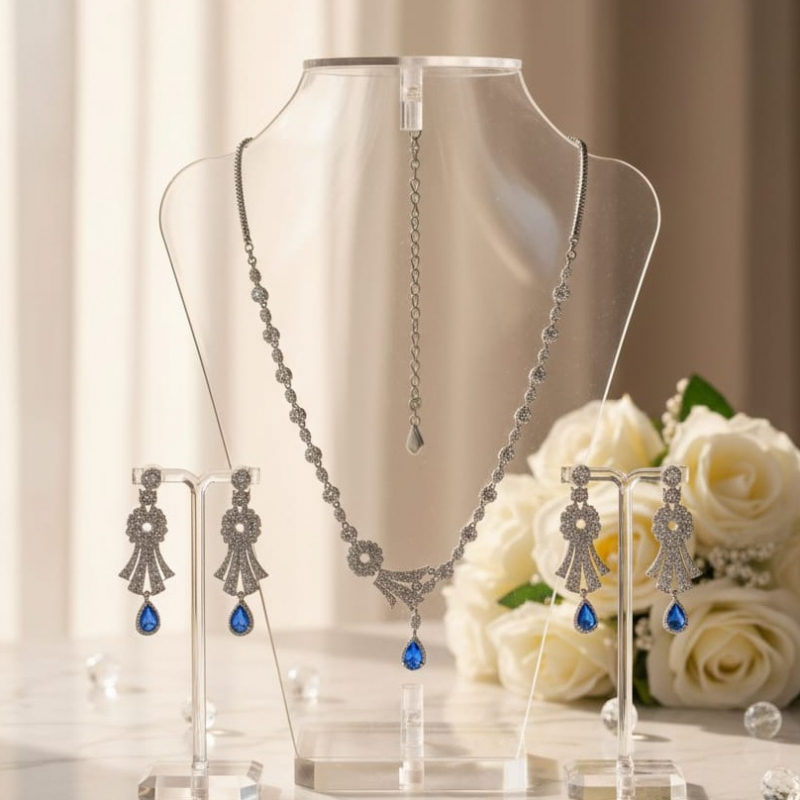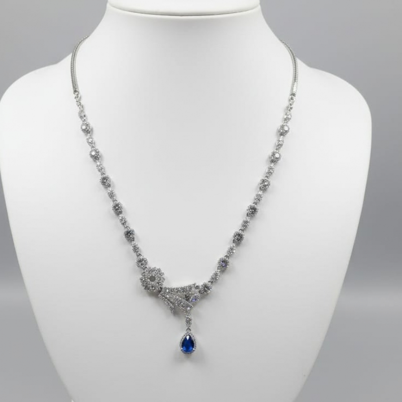 Add a touch of regal charm to your jewelry collection with the Royal Sapphire Elegance Necklace Set. Crafted in a radiant silver-tone finish, this exquisite set features dazzling white stones beautifully arranged in a graceful floral-inspired pattern. The highlight of the design is the deep blue teardrop stone that adds richness and luxury to the overall look.