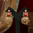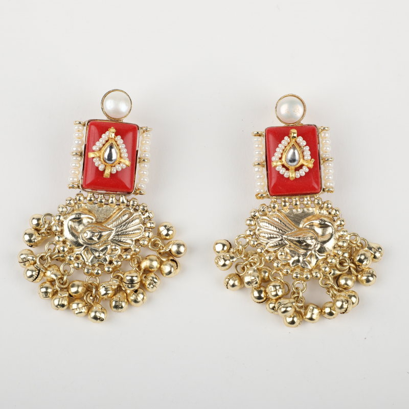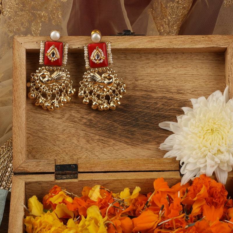 Celebrate timeless Indian artistry with these handcrafted statement earrings, designed to make every look feel festive and regal. The earrings feature a bold red enamel rectangular top, delicately bordered with pearls and highlighted by a classic kundan teardrop motif. Below, an intricately carved gold-toned bird element adds a traditional touch, finished with clusters of ghungroo-inspired dangling beads that create graceful movement with every step.