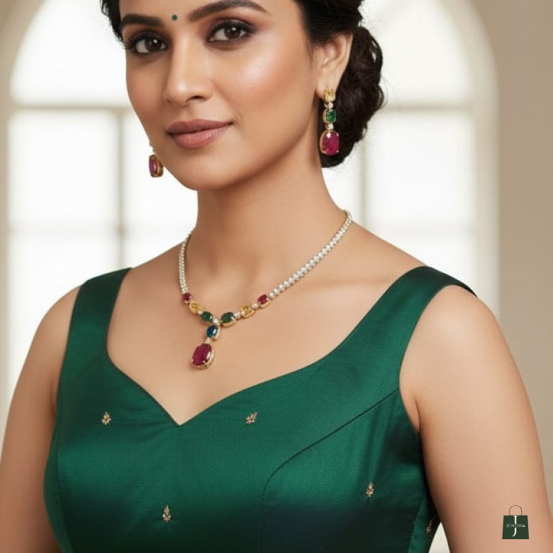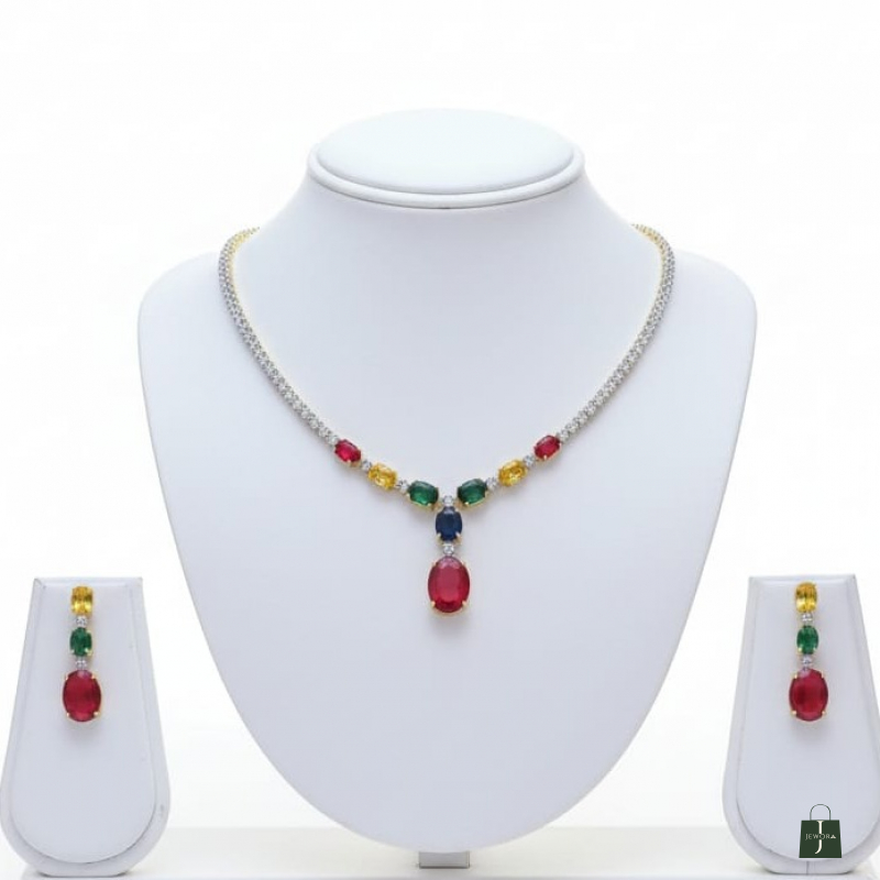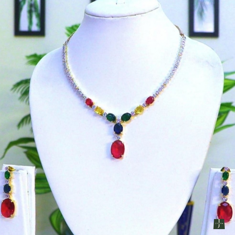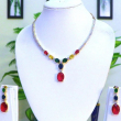 Bright, bold, and beautifully balanced — this multicolor gemstone necklace set is crafted to make a statement. Featuring a delicate silver-tone chain leading to a symmetrical arrangement of richly colored oval stones, the design is crowned with a striking deep red drop pendant that adds drama and sophistication.