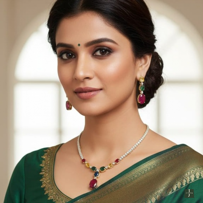 The harmonious blend of red, yellow, green, and blue stones creates a regal spectrum effect, while the matching drop earrings echo the same vertical color pattern for a perfectly coordinated look. This set is ideal for festive celebrations, weddings, parties, and statement styling.
