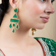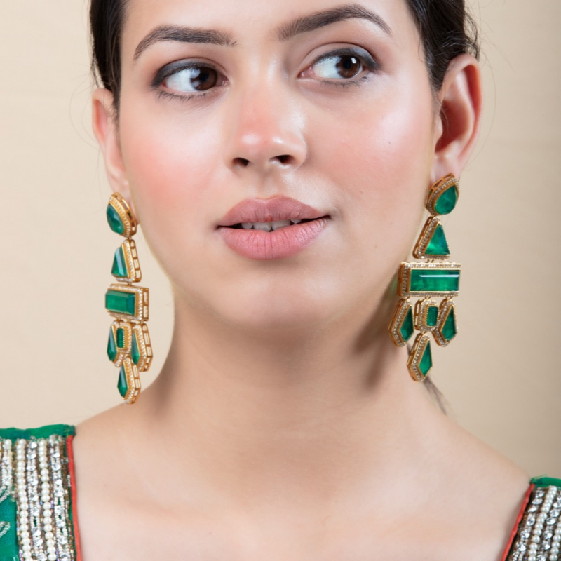 The jewelry features a stunning pair of statement earrings with a bold and elegant design.Oversized rectangular green stone earrings with intricate gold detailing.