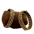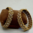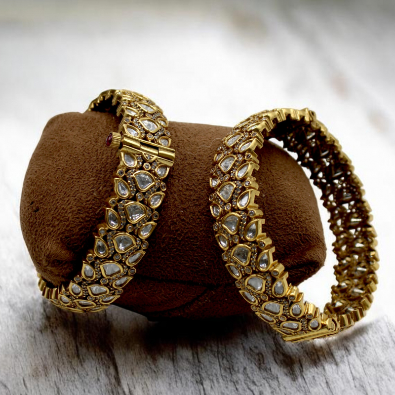 Make a bold bridal statement with these exquisitely crafted kundan kada bangles. Designed with layered teardrop-shaped clear kundan stones arranged in a dense floral cluster pattern, these bangles radiate traditional grandeur. The antique gold finish enhances the brilliance of the stones, while the intricate inner lattice work reflects fine craftsmanship. Perfect for weddings, festive occasions, and grand celebrations, these bangles offer a luxurious and timeless appeal.