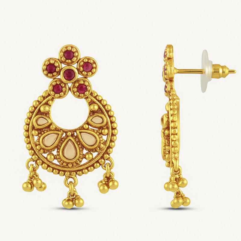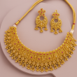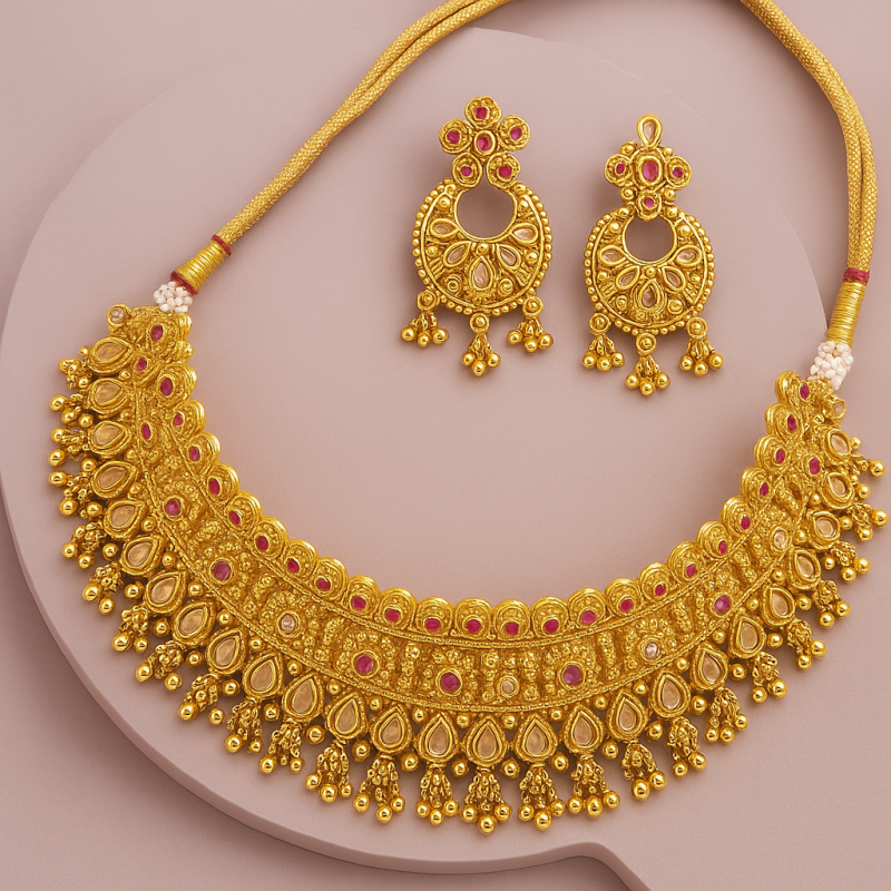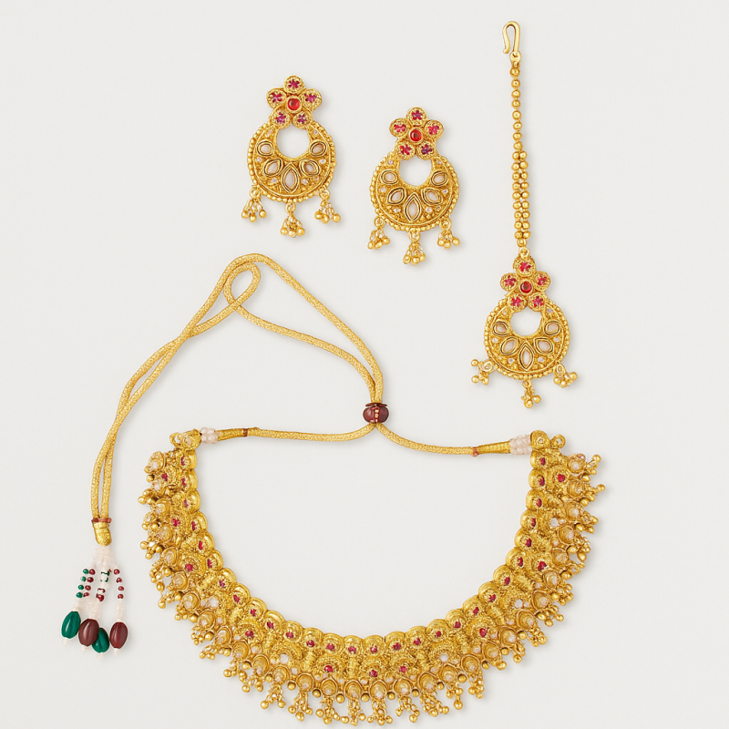 Elevate your festive and bridal look with this magnificent **Royal Temple Kundan Choker Set**, designed with intricate detailing and traditional craftsmanship. The set features a broad golden choker adorned with ruby red stones and temple-inspired motifs, perfectly complemented by matching earrings and a maang tikka. The antique gold polish enhances its regal charm, making it ideal for weddings, festive occasions, or cultural celebrations. Crafted with precision using high-quality alloy and embellished with Kundan stones, this set beautifully balances tradition with elegance. The lightweight design ensures comfortable wear throughout grand occasions, making it a must-have for brides and those seeking statement traditional jewelry.