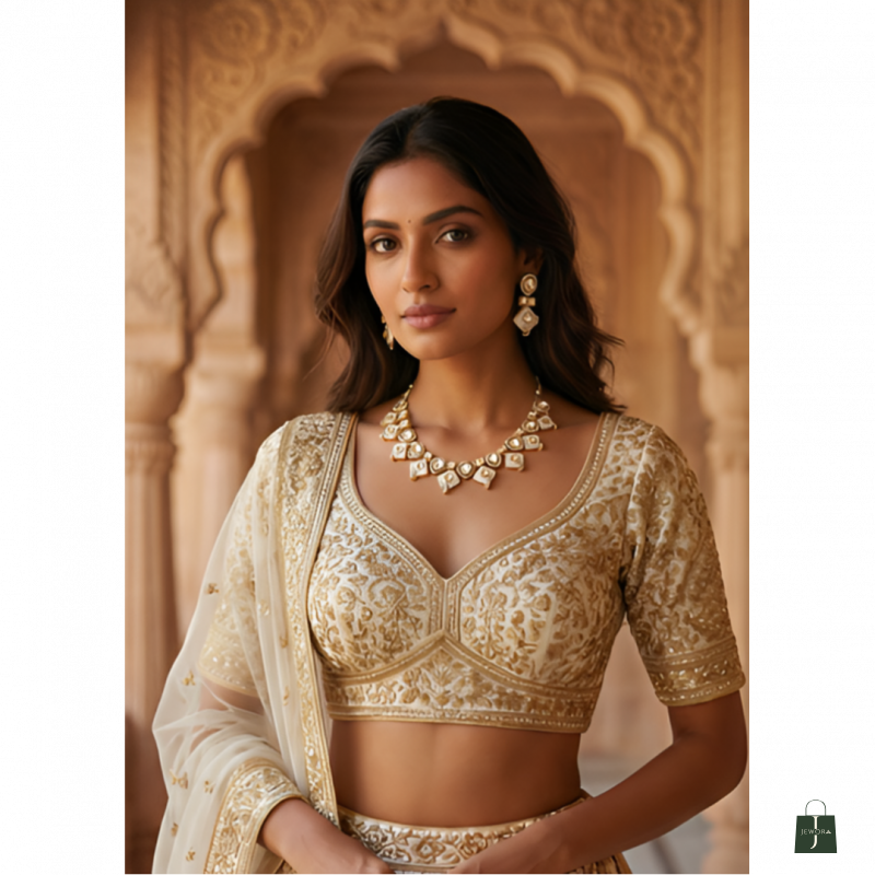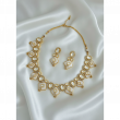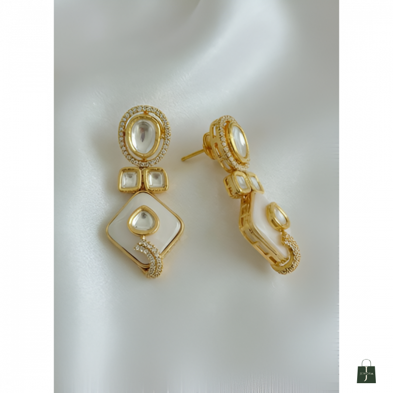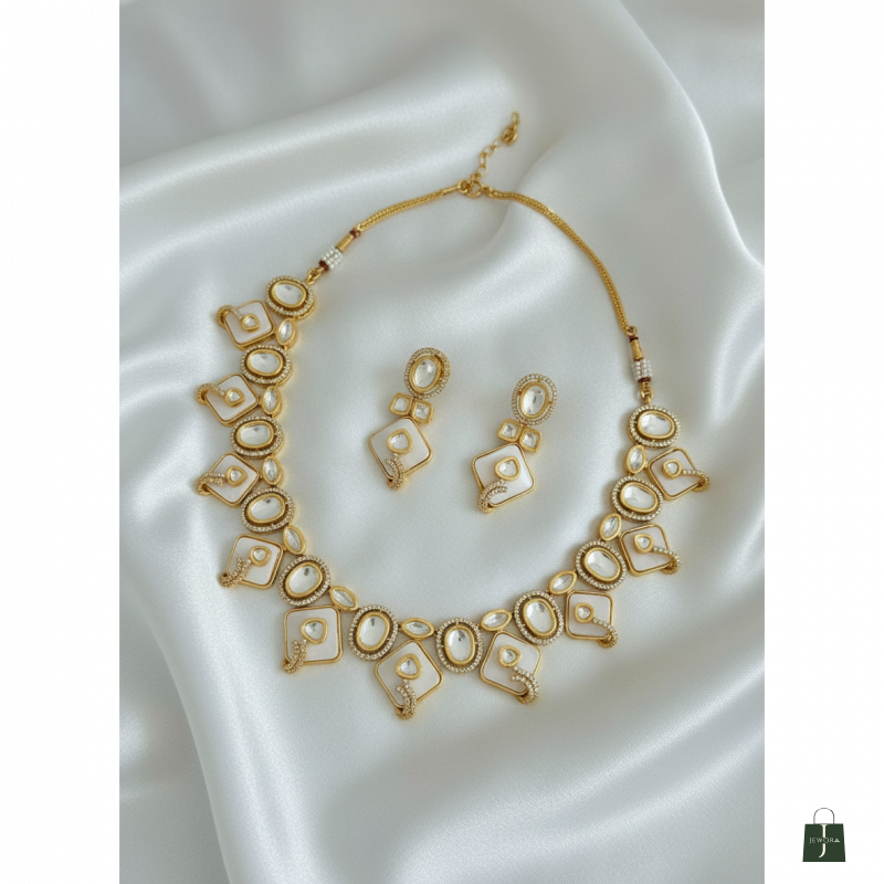Elevate your ethnic look with this Royal White Moissanite Kundan Necklace & Earrings Set. This exquisite imitation jewellery set features intricate Kundan craftsmanship with contemporary geometric design, perfect for weddings and festive occasions.
