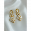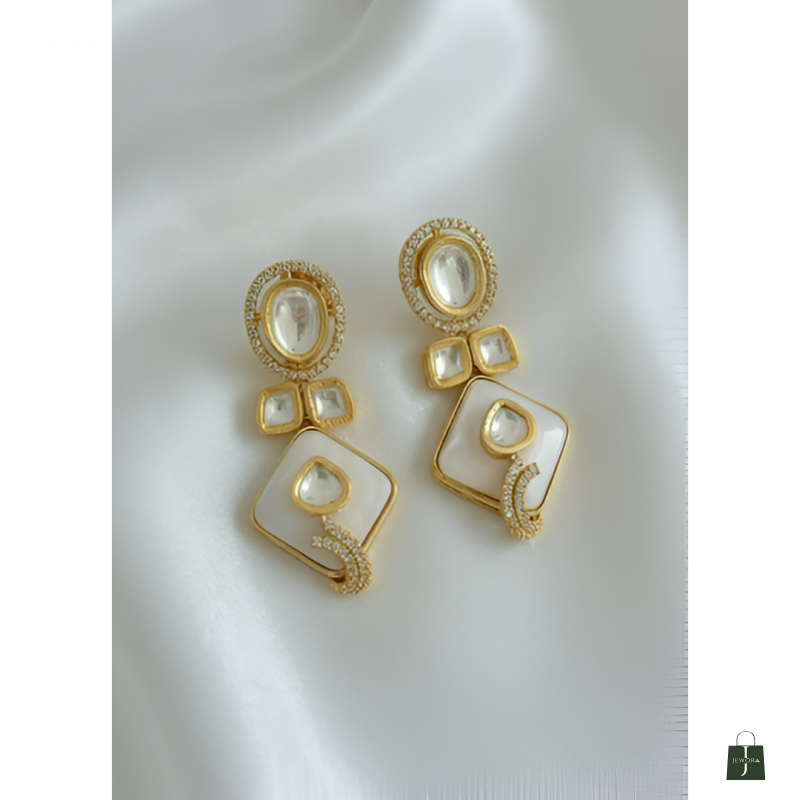 Design: Contemporary geometric necklace featuring alternating oval and square shapes adorned with Moissanite Kundan work and white enamel detailing. The matching three-tier drop earrings showcase the same elegant geometric pattern with beautiful proportions.