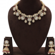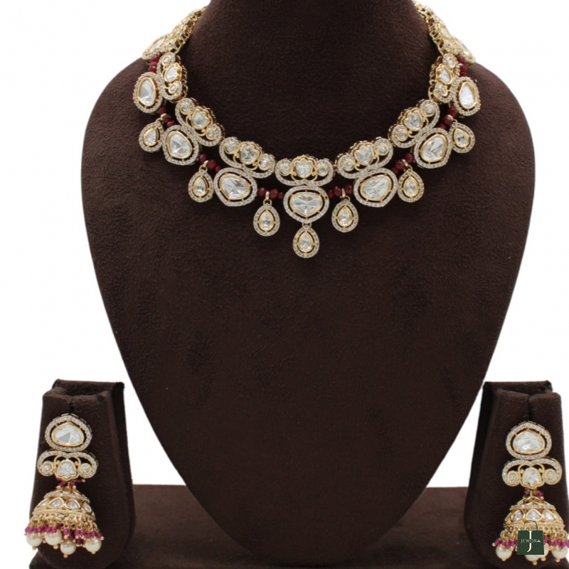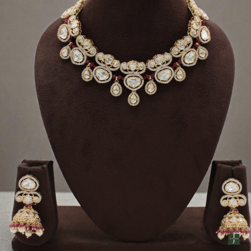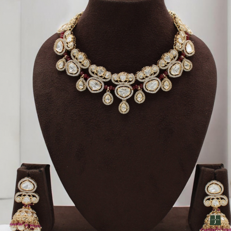 The set includes matching jhumka earrings, detailed with Polki stones, pearl drops, and ruby-tone bead highlights, making it a perfect choice for weddings, receptions, and festive celebrations.