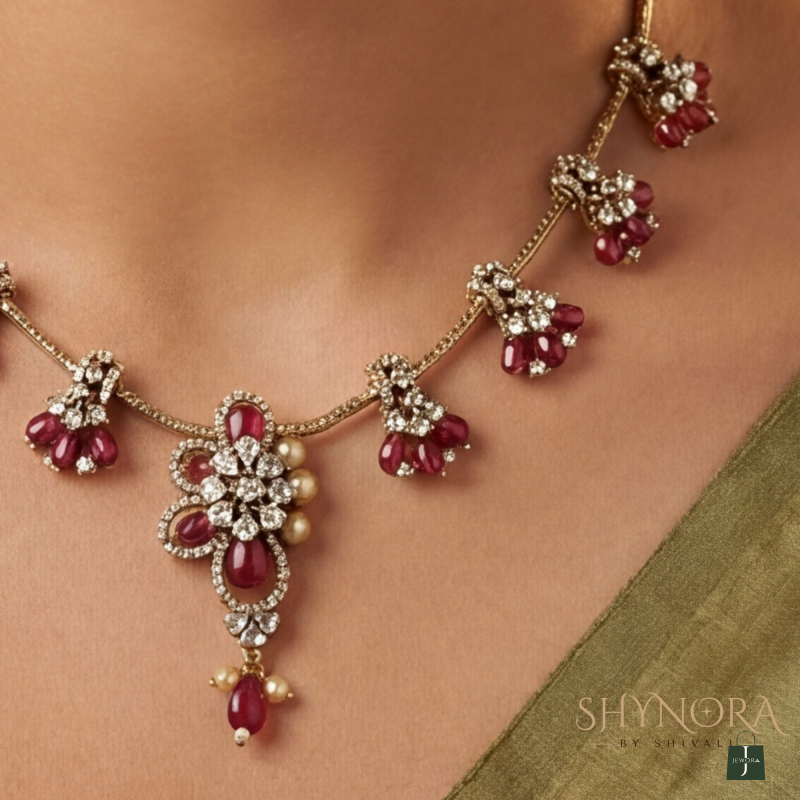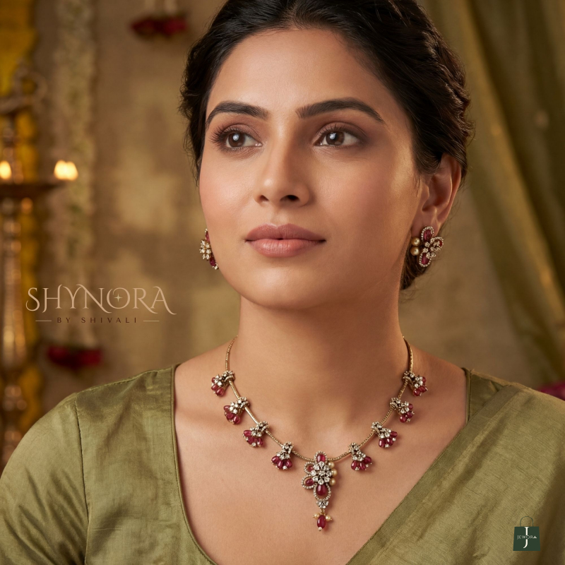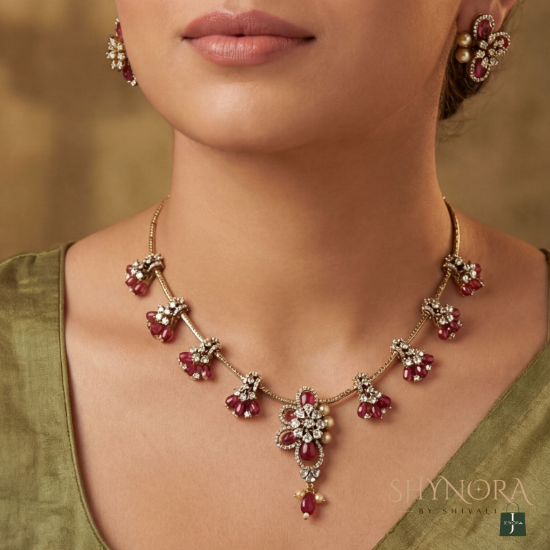 The Ruby Bloom Drop Necklace Set is a graceful blend of delicate craftsmanship and classic charm. Designed with a fine gold-toned chain, this necklace features evenly spaced floral drop motifs accented with deep ruby-red beads that add a subtle pop of color. The central floral pendant, highlighted with sparkling stones and a ruby drop, creates a soft yet elegant focal point.