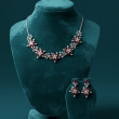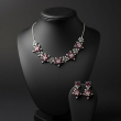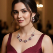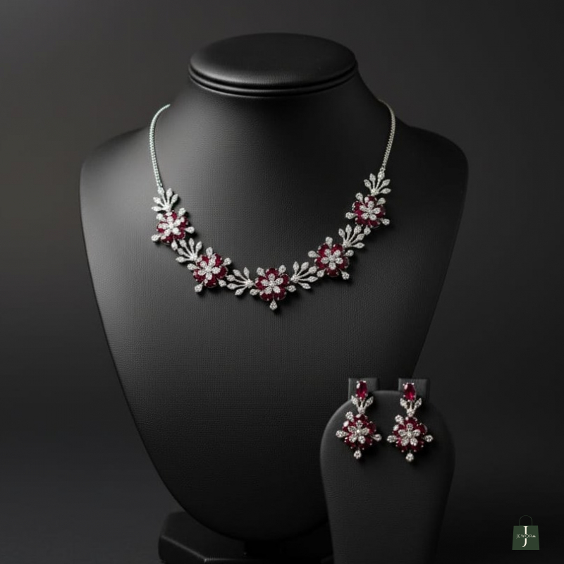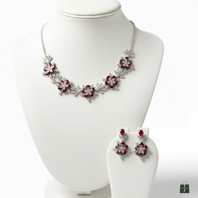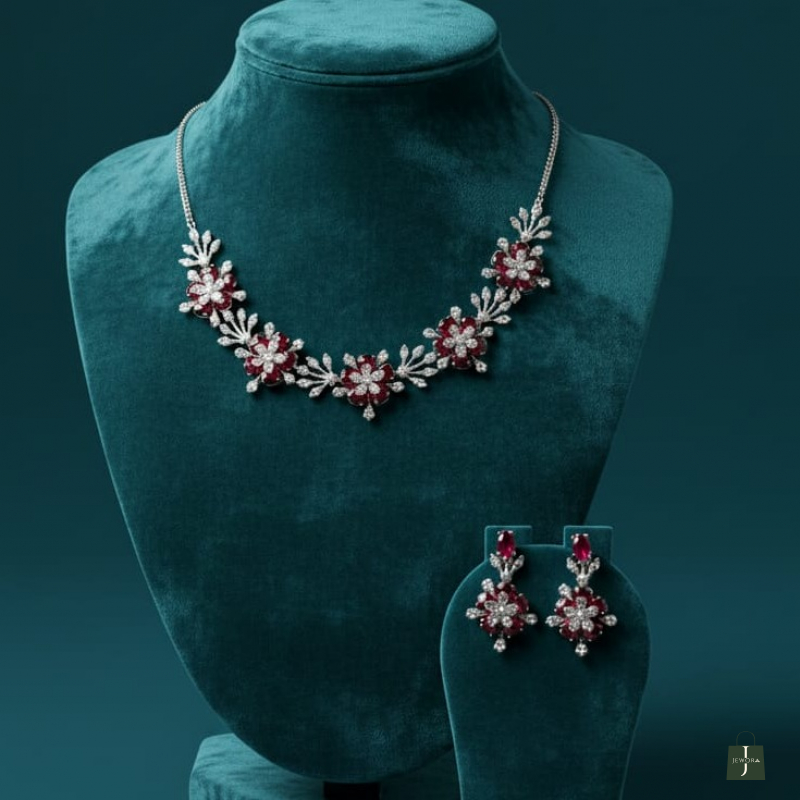 Elevate your elegance with the Ruby Bloom Floral Necklace Set, a beautifully crafted jewellery set inspired by blooming flowers. This exquisite set features rich ruby-red stones delicately arranged in floral motifs, highlighted with shimmering American diamonds for a luxurious finish. Perfect for weddings, festive celebrations, receptions, and special occasions, this set adds timeless charm and sophistication to your look.