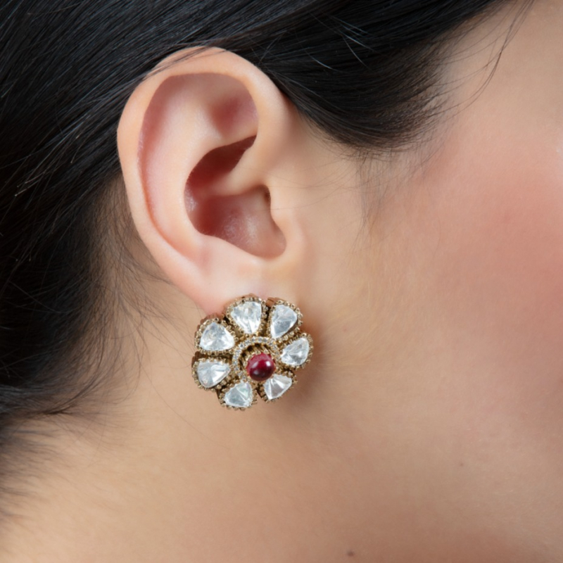 Add a touch of classic elegance to your look with these beautifully crafted floral stud earrings. Designed with delicate white kundan stones arranged as petals around a rich ruby red center stone, these earrings offer a timeless ethnic appeal. The compact yet eye-catching design makes them perfect for everyday ethnic wear as well as festive occasions. Lightweight and comfortable, these studs are ideal for effortless styling.