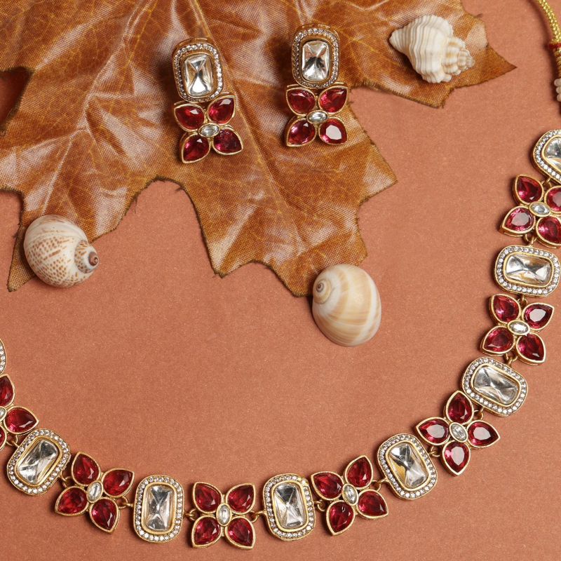 Enhance your festive look with this stunning ruby blossom kundan necklace set, beautifully designed with floral motifs and rich red stones. The intricate arrangement of petal-shaped ruby stones paired with sparkling rectangular crystal kundan elements creates a luxurious and eye-catching design. Finished in a radiant gold tone, this necklace sits gracefully on the neckline, while the matching earrings complete the elegant ensemble. Perfect for weddings, festive occasions, and grand celebrations.
