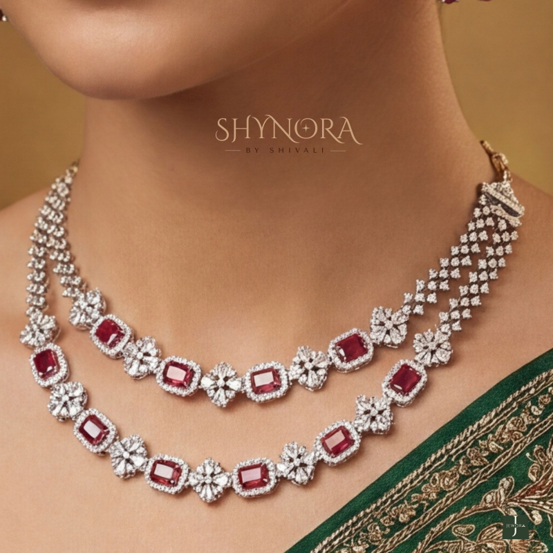Elevate your festive and bridal look with this elegant Ruby Blossom layered necklace set, designed to exude timeless charm and graceful sophistication. Featuring radiant ruby-red rectangular stones accented with sparkling diamond-finish crystals, this set showcases a beautiful dual-layer necklace design that sits effortlessly on the neckline.