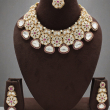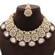 Paired with matching earrings and a coordinating maang tikka, this set exudes royal heritage charm, making it ideal for weddings, receptions, and festive celebrations. The rich gold polish and detailed craftsmanship give it a luxurious and statement appeal.