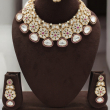 Enhance your bridal look with this exquisite Kundan choker set featuring intricate floral motifs highlighted with vibrant ruby-pink accents. The necklace showcases premium uncut ivory-toned Kundan stones beautifully arranged in layered floral clusters, complemented by teardrop-shaped stones framed with delicate pink detailing.