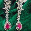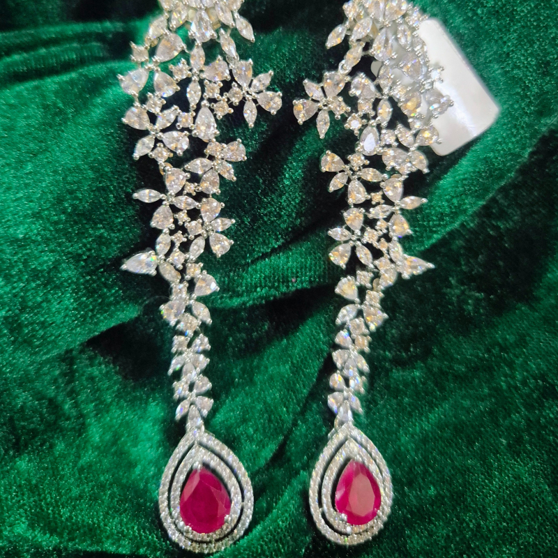 Turn heads with these stunning long vine-style statement earrings, designed to exude elegance and luxury. Crafted with intricate floral crystal detailing, these earrings feature a cascading design adorned with sparkling white stones that beautifully catch the light. The highlight is the bold ruby-colored teardrop stone at the bottom, framed with shimmering crystals for a rich and glamorous finish. Perfect for weddings, parties, and evening occasions, these earrings add a graceful and sophisticated touch to any outfit.
