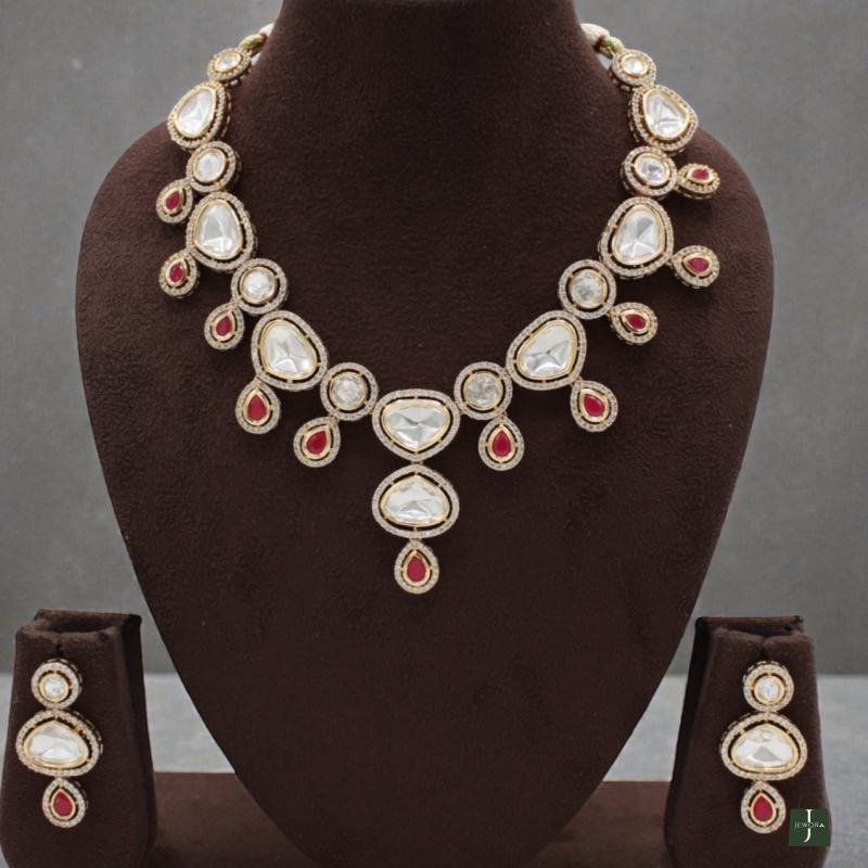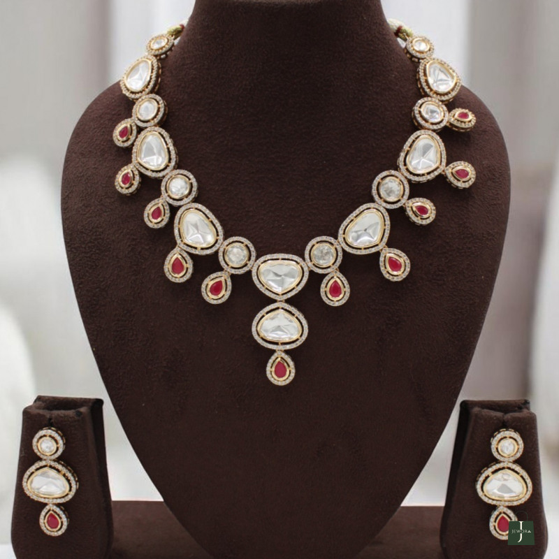 Add royal charm to your jewellery collection with this stunning Kundan Necklace Set, beautifully designed with pear-shaped white stones and highlighted with rich ruby-red drop accents. The necklace features layered teardrop motifs with delicate round stone connectors, creating a graceful cascading effect.
