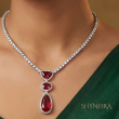 Add a touch of timeless sophistication to your jewelry collection with this Ruby Elegance AD pendant necklace set. Designed with a sleek diamond-style chain, the necklace features a stunning vertical pendant adorned with deep ruby-red stones in elegant geometric and teardrop cuts, beautifully outlined with shimmering AD (American Diamond) detailing.
