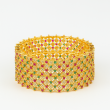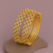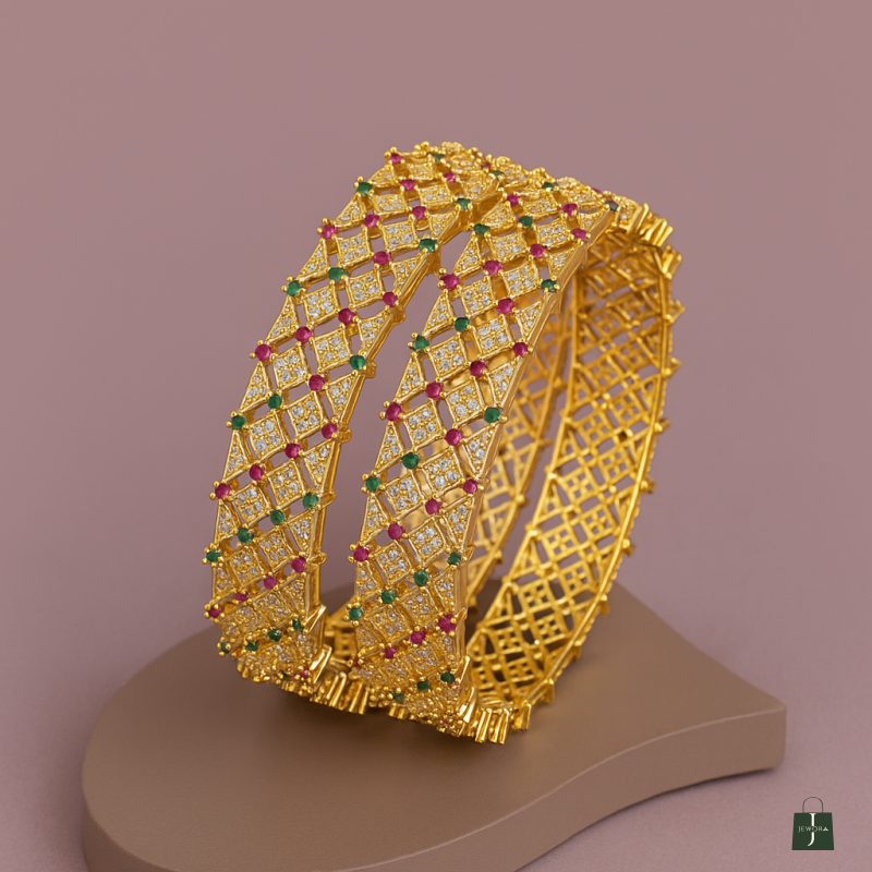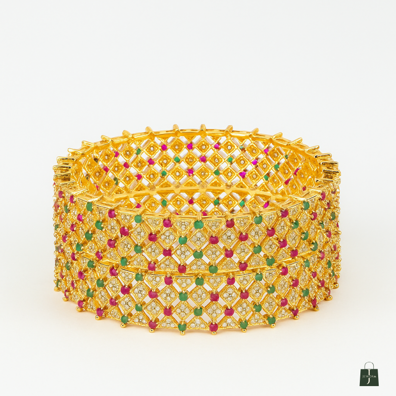 Add a royal touch to your jewelry collection with these breathtaking ruby and emerald lattice bangles. Expertly crafted with a radiant gold polish, the design features an intricate crisscross pattern set with brilliant American Diamonds (CZ), deep ruby red stones, and striking emerald green accents. The fine craftsmanship brings together elegance and tradition, making these bangles a perfect fit for festive occasions, weddings, or bridal wear. The rich detailing and multicolor stones enhance their luxurious appeal, while the secure fit ensures comfort for long wear. A timeless piece that blends modern brilliance with classic charm.