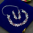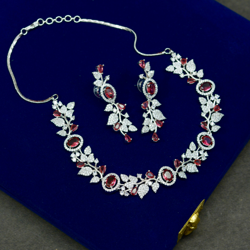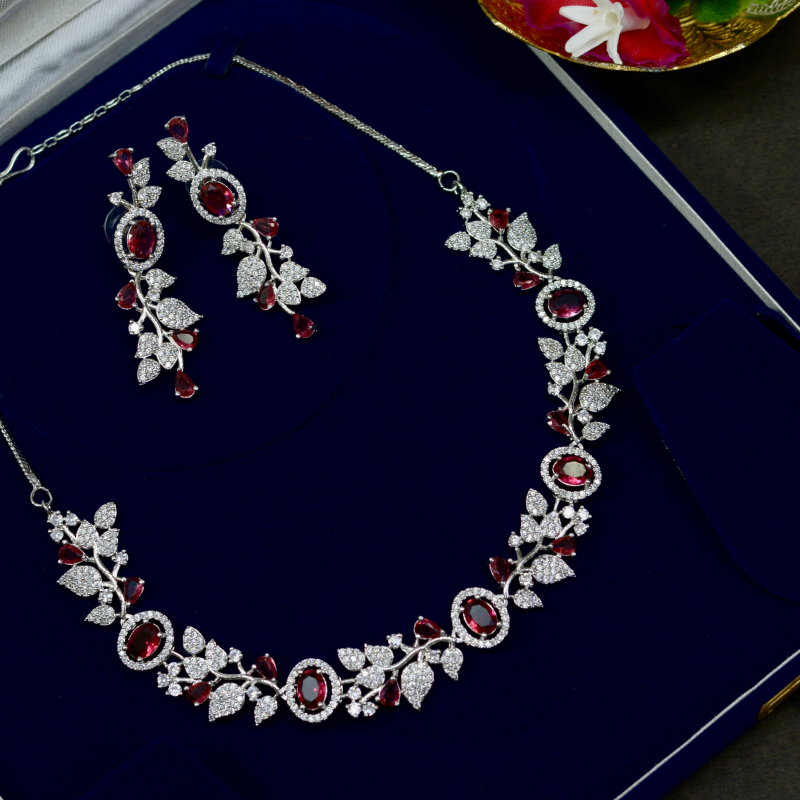 Designed with flowing floral vine patterns, this necklace set blends shimmering silver tones with vibrant ruby accents. The fine detailing enhances its premium charm while maintaining a lightweight feel, making it perfect for celebrations, parties, and sophisticated ethnic styling without compromising affordability.