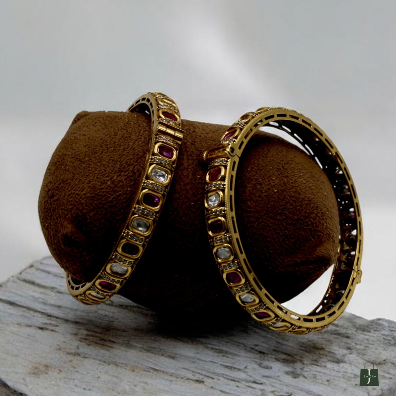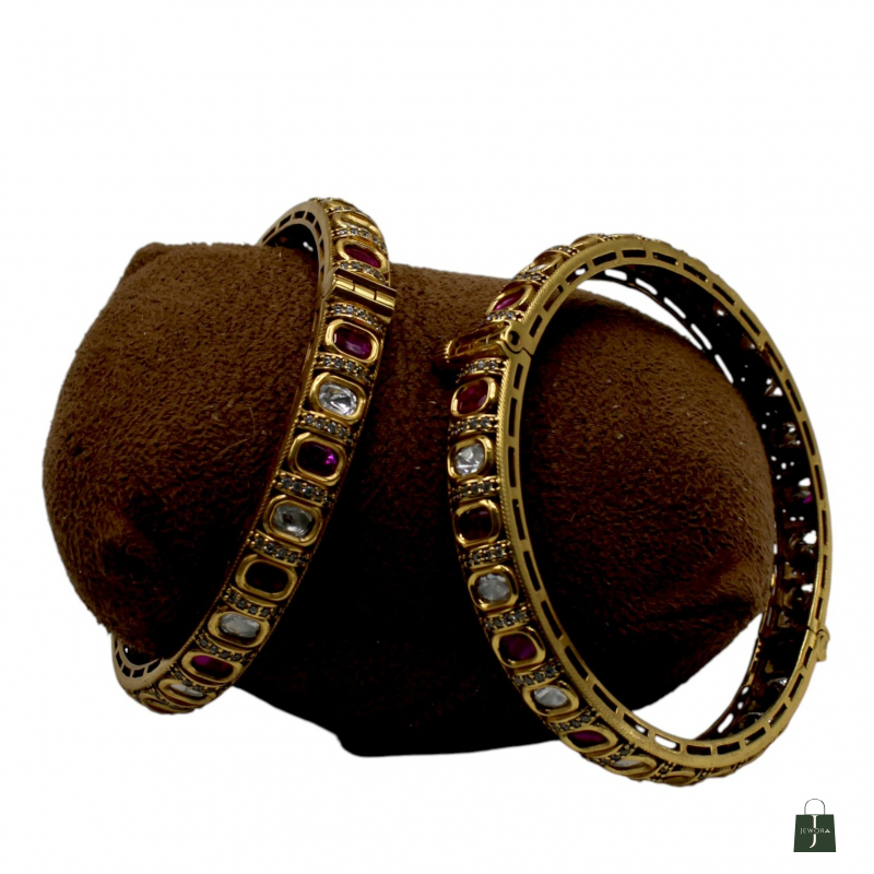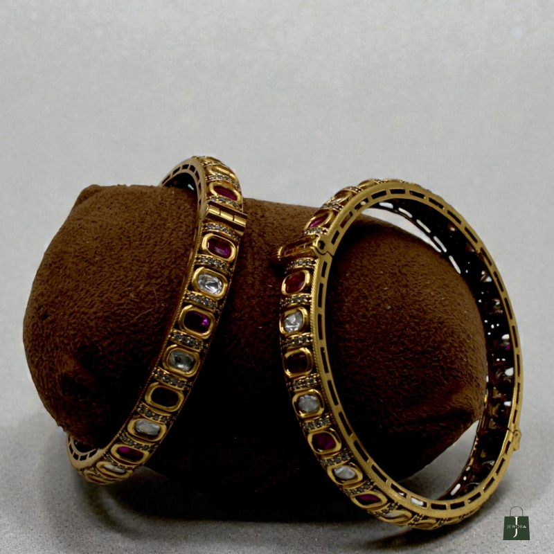 This elegant kada pair features a structured gold-toned base beautifully adorned with alternating ruby-toned and white polki-style stones. The rectangular stone settings are aligned in a symmetrical pattern, giving the bangles a refined and premium look. Fine micro stone detailing between each setting enhances the sparkle and adds depth to the design.