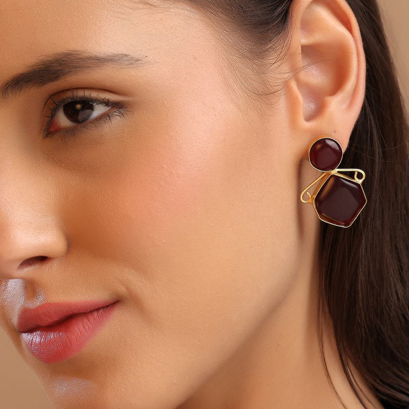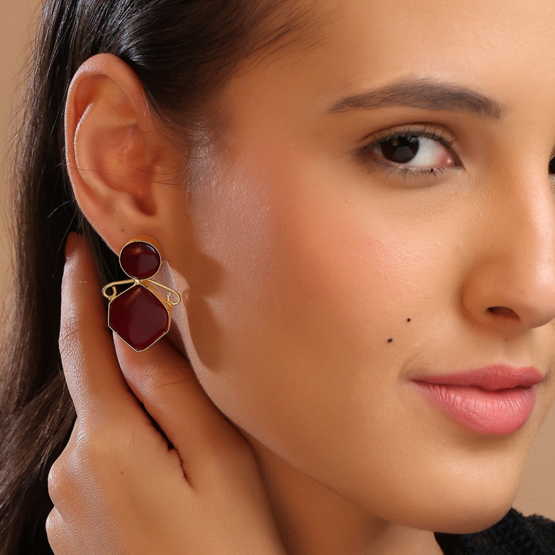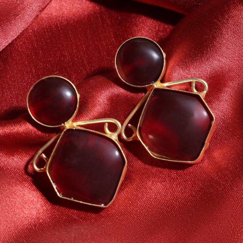 Add a bold touch of elegance to your look with these ruby glow geometric earrings. Designed with a rich red stone in a sleek geometric silhouette, these earrings combine modern minimalism with timeless charm. The smooth, glossy finish of the stones paired with a refined gold-tone frame makes them a perfect statement piece. Ideal for both everyday styling and special occasions, these earrings effortlessly enhance your outfit with a vibrant pop of color.