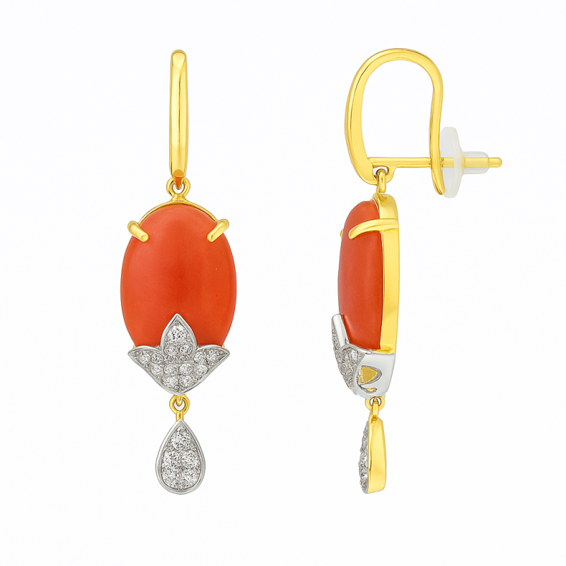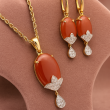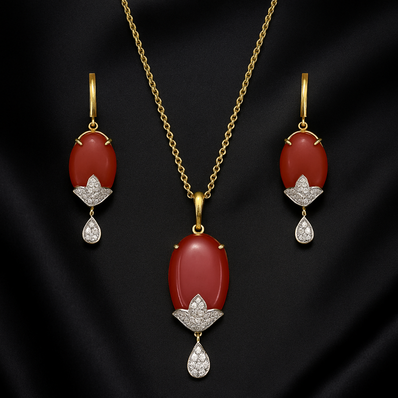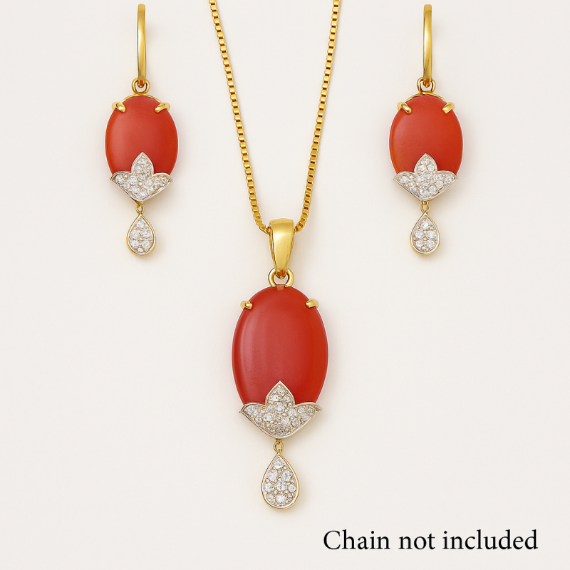 The Ruby Glow Oval Pendant Set showcases a striking oval-shaped ruby red gemstone, highlighted with shimmering American Diamond (CZ) accents in floral and teardrop motifs. Designed with a gold-polished finish, this elegant pendant set is complemented with matching earrings, making it an ideal choice for festive and bridal occasions.