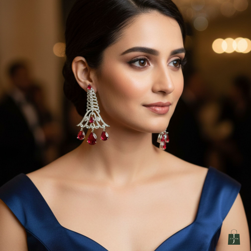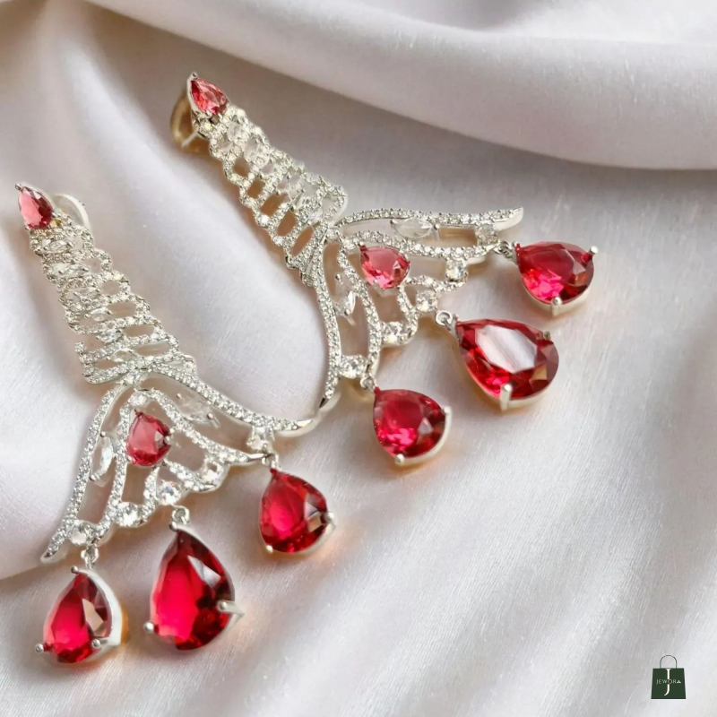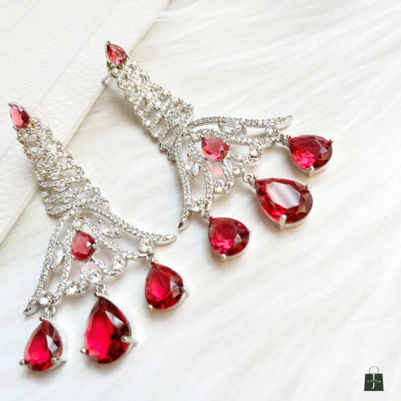 The Ruby Grace Diamond Drop Earrings feature a graceful wing-inspired design adorned with sparkling diamond-cut stones and rich ruby-red teardrop accents that create stunning movement and brilliance. Finished in a luxe silver-tone setting, these statement earrings are perfect for weddings, receptions, cocktail evenings, and festive occasions, adding refined elegance to both ethnic and contemporary look