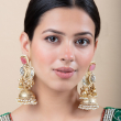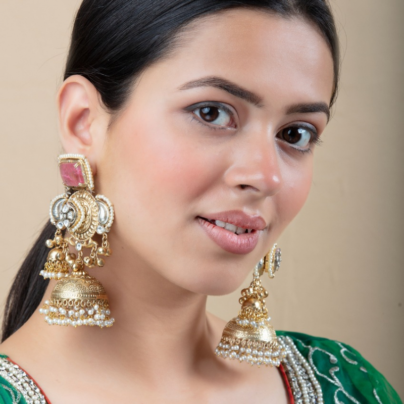 Enhance your ethnic elegance with these stunning jhumka earrings featuring a bold ruby pink rectangular stone at the top, framed with delicate pearl detailing. The central design showcases intricate kundan craftsmanship with traditional motifs, complemented by side elements and hanging ghungroo-style accents. The classic dome-shaped jhumka is adorned with fine carvings and layers of pearl drops, adding graceful movement and richness. Perfect for weddings and festive occasions, these earrings bring timeless charm to any traditional outfit.