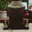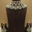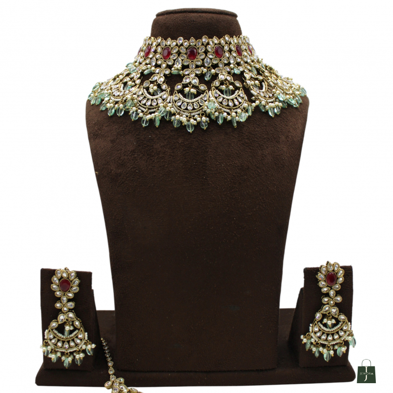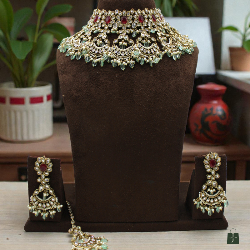 Make a majestic bridal statement with this exquisitely crafted Kundan choker set featuring rich ruby-toned stones beautifully paired with soft mint green bead drops. The intricate floral and crescent-inspired design is adorned with polki-style uncut stones, creating a timeless royal look.