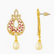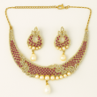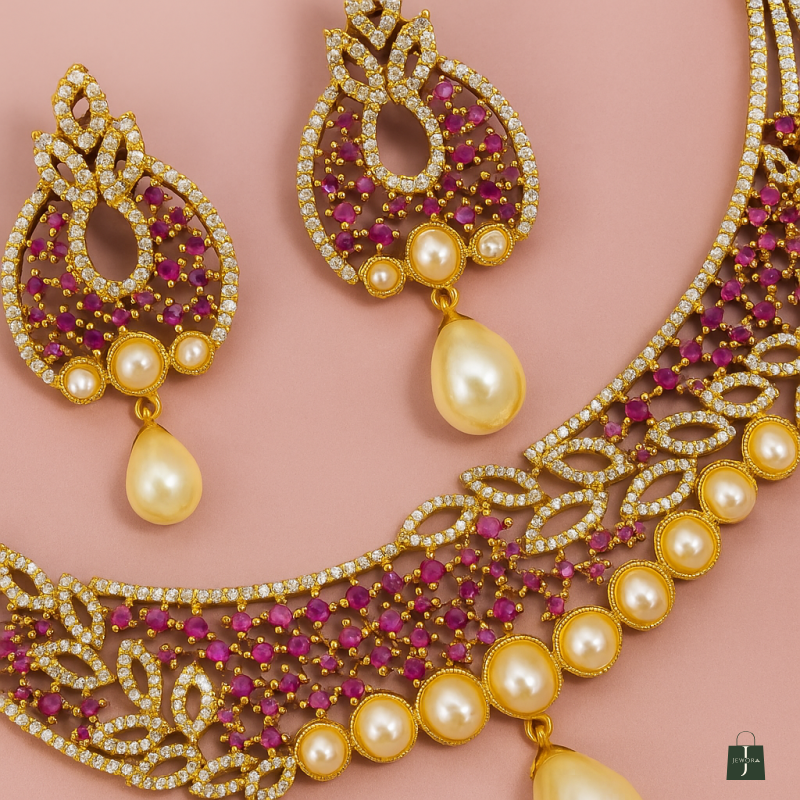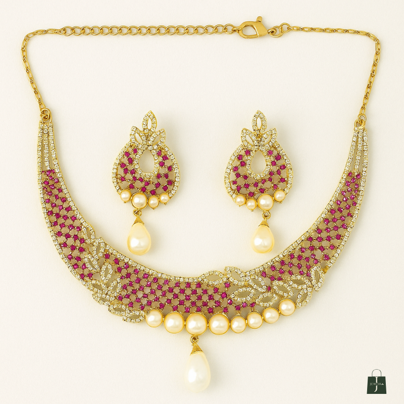 The Ruby Pearl Drop Gold Necklace Set is a perfect blend of traditional charm and modern artistry. The necklace features a delicate lattice design studded with sparkling ruby-red stones, accentuated by shimmering white American Diamonds (CZ). A graceful row of pearls with a central teardrop pearl pendant adds elegance and sophistication. The matching earrings mirror the intricate motif with pearl drops, completing the set. An ideal choice for weddings, festive occasions, and cultural celebrations, this set adds timeless grace to any attire.