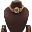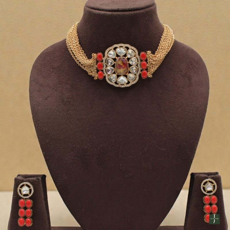 Make a bold royal statement with this luxurious ruby polki choker set. Crafted with multiple fine gold-toned chains, the necklace features a striking oval medallion centerpiece adorned with uncut polki-style stones and a rich ruby-toned center stone. Vibrant red side accents enhance the regal charm and add a powerful festive appeal.