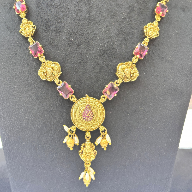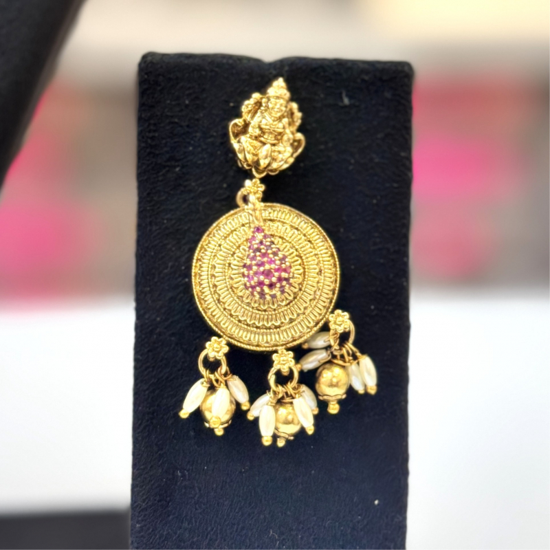 Designed to enhance your beauty on bridal occasions, festive celebrations, and cultural events, this set brings a regal touch to any traditional attire. The round pendant with ruby detailing and antique finish reflects divine charm, making it an ideal choice for women who value tradition with sophistication.