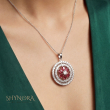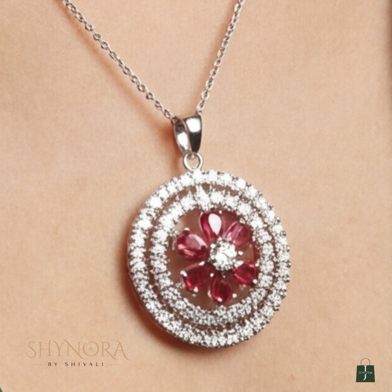 The Ruby Radiance Circular AD Pendant Set showcases a striking floral design crafted with deep ruby-red teardrop stones arranged in a radiant bloom at the center. Encircled by a sparkling double halo of premium American Diamonds, the set exudes timeless elegance and festive charm.