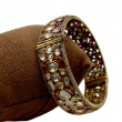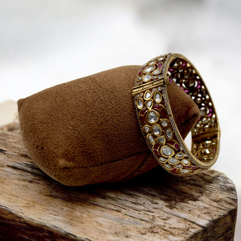 Enhance your ethnic look with this stunning handcrafted Kundan Polki bangle, designed with intricate floral and jaal patterns. The sparkling uncut white stones are beautifully complemented by rich ruby pink enamel accents, creating a bold and festive appeal. The detailed craftsmanship and elegant gold polish make it a perfect choice for weddings, bridal wear, and special occasions.