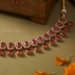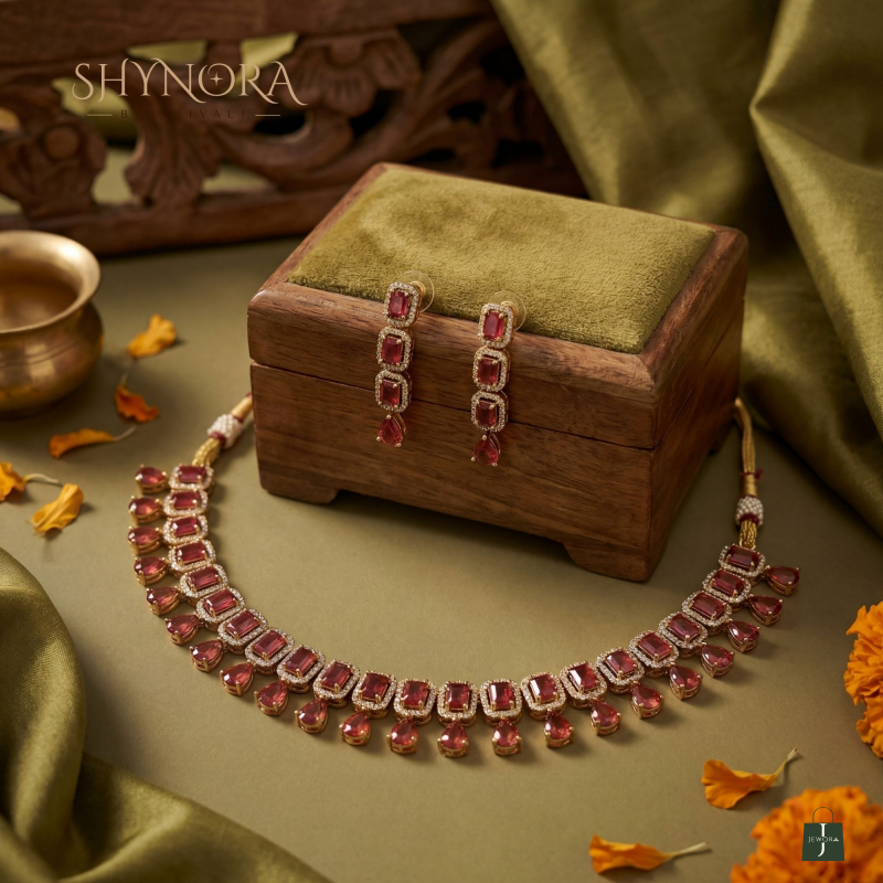 Add a touch of royal elegance to your look with this Ruby Red AD Choker Necklace Set. Designed with sparkling American Diamonds and rich ruby red stones, this choker features a neat line of rectangular stones finished with delicate teardrop drops for a graceful shine.