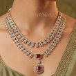 Make a bold statement with this Ruby Red American Diamond Layered Necklace Set, crafted for a rich and regal look. Featuring two elegant AD-studded layers with classic oval motifs, the set is beautifully highlighted with ruby red center stones that add depth and royal charm.