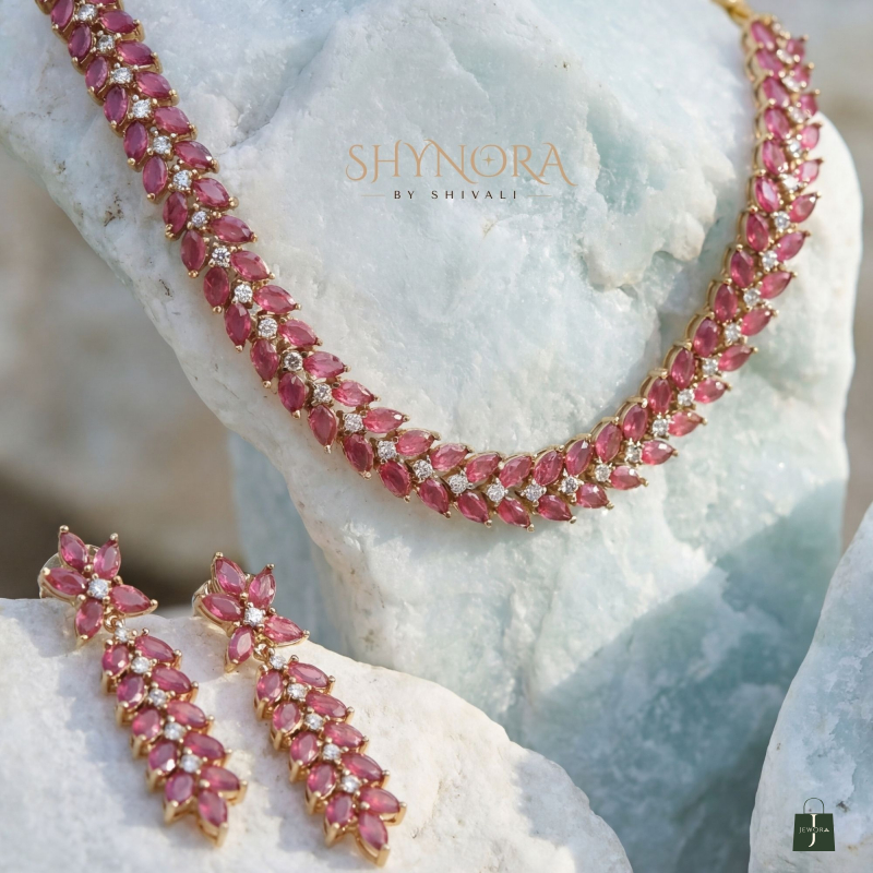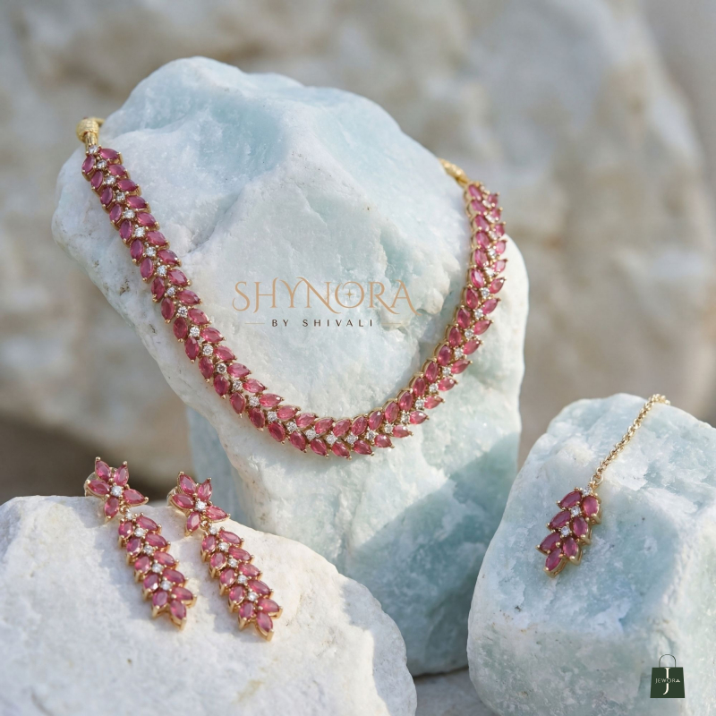 This beautiful AD (American Diamond) necklace set comes in a rich ruby red colour, giving it a classy and elegant look. The necklace has a neat, close-neck design with closely set red stones that shine beautifully and sit comfortably on the neck.