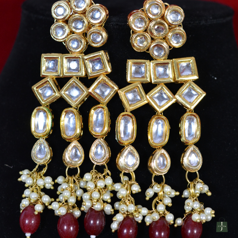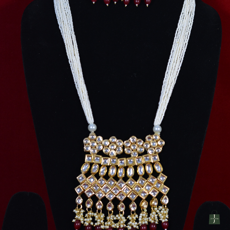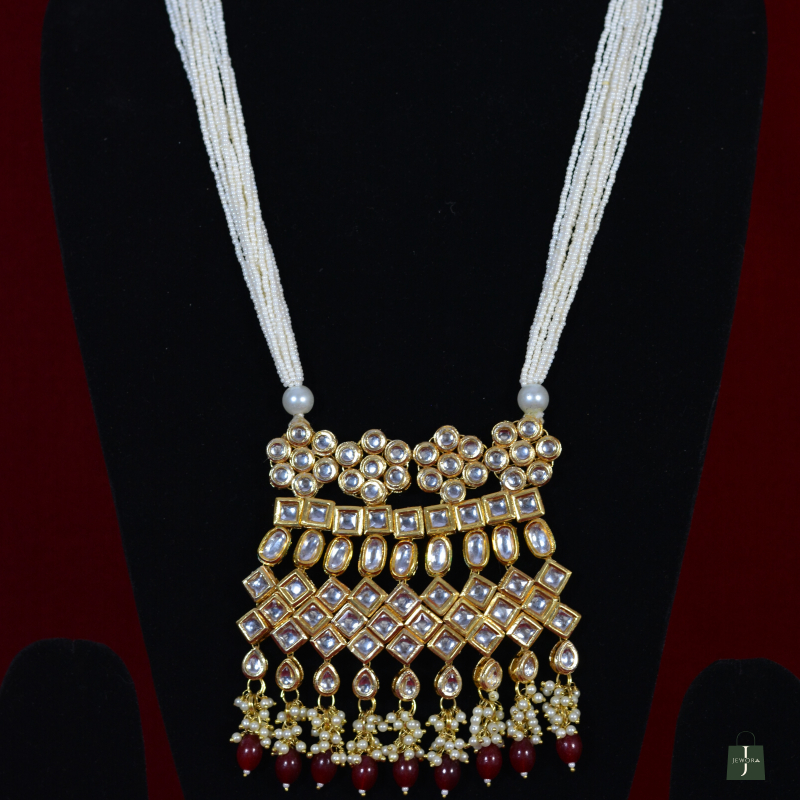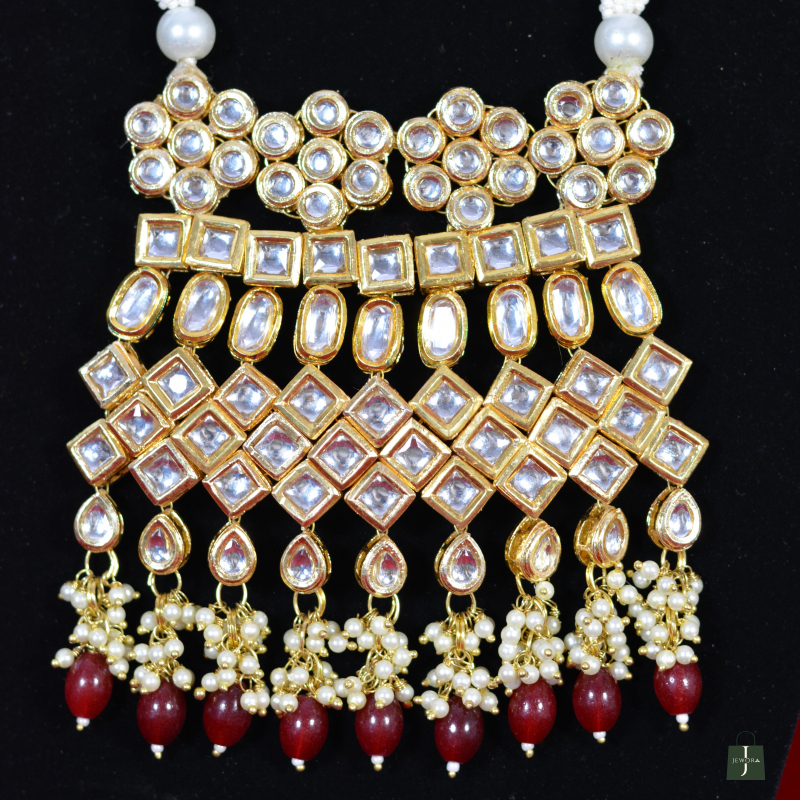 This elegant Kundan necklace set features multiple strands of rich ruby red beads paired with a beautifully crafted Polki centerpiece. The gold-toned brass base highlights the brilliance of the stones, while matching earrings add balance and grace. Designed to deliver a luxurious look at an affordable price, it is perfect for weddings, festive events, and traditional celebrations.